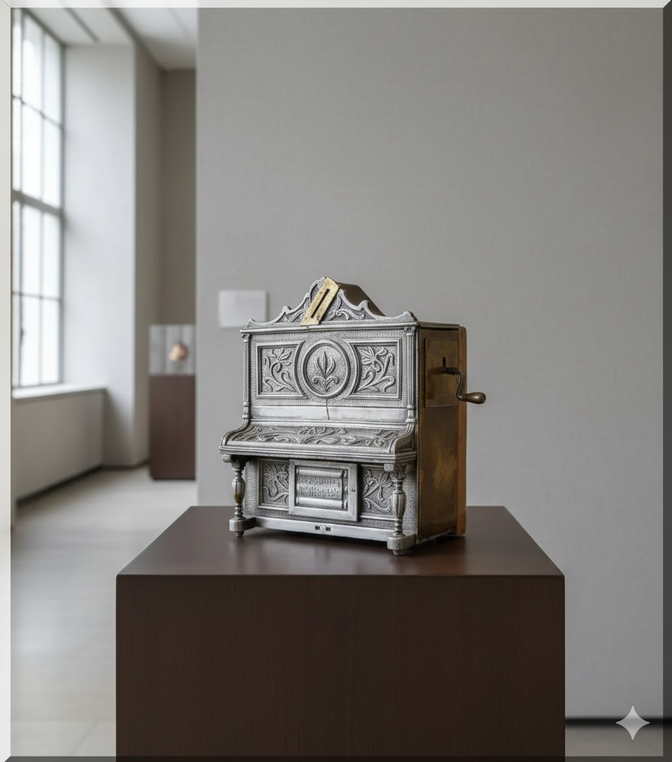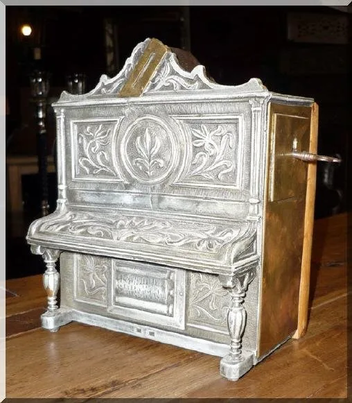 Antico salvadanaio in stile Liberty del 1910 circa in ottone che suona la canzone Tulipani da Amsterdam quando si inserisce una moneta. Dimensioni: larghezza 0,19 m, altezza 0,22 m, profondità 0,13 m.