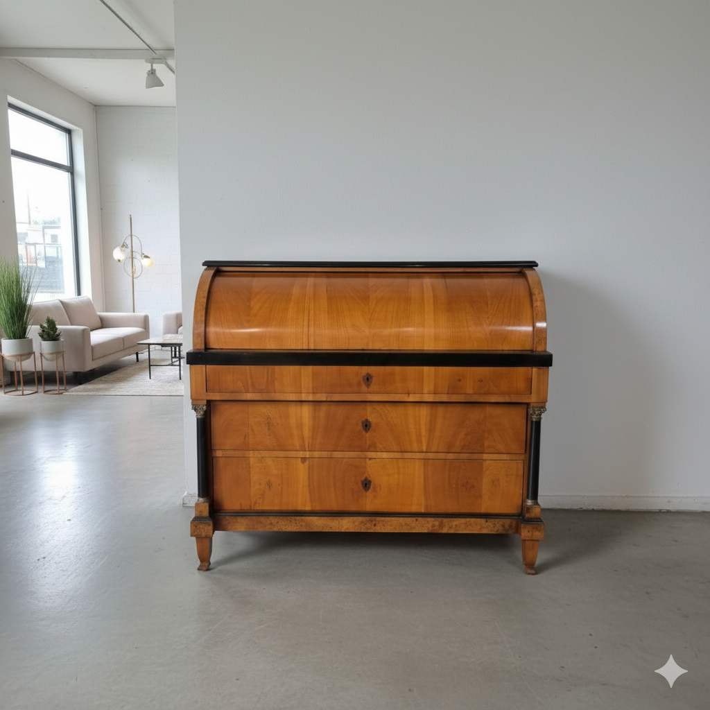 Restaurierter Biedermeier Sekretär in Kirschbaum furniert und von Grund auf Schellack poliert von ca. 1820. Der Schreibtisch befindet sich in einem sehr guten Zustand und weist nur minimale Gebrauchsspuren auf.    7 Schubladen 1 kleines offenes Schrankfach Kirschbaum Furnier Schellack Biedermeier ca. 1820   Maße:   Breite 1,20 m Höhe 1,08 m Tiefe 0,60 m