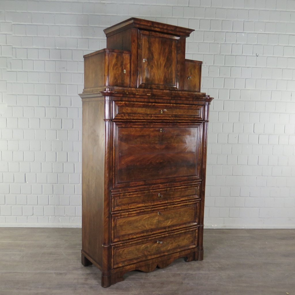Restaurierter Biedermeier Sekretär in Mahagoni furniert und von Grund auf Schellack poliert von ca. 1850. Der Sekretär befindet sich in einem guten Zustand und weist nur leichte Gebrauchsspuren auf. Zerlegbar (2-teilig). • 14 Schubladen• 3 Regalboden • Mahagoni Furnier• Schellack• zerlegbar • Biedermeier ca. 1850 Maße: Breite 1,13 m Höhe 2,10 m Tiefe 0,56 m