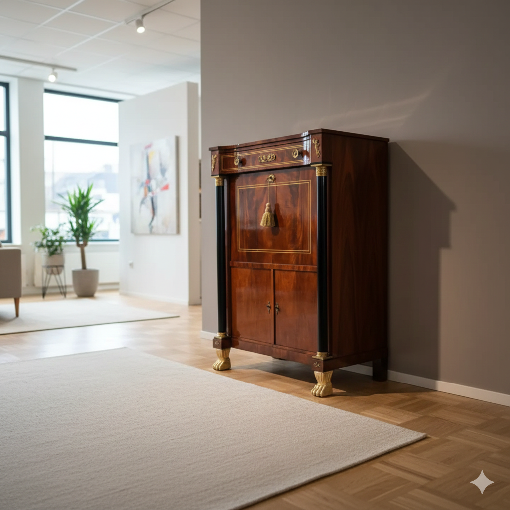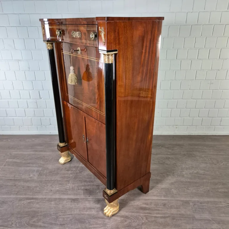 Restaurierter Empire Sekretär in Mahagoni furniert und von Grund auf Schellack poliert von ca. 1810. Der mit den originalen Beschlägen aus Bronze versehene Sekretär befindet sich in einem sehr guten Zustand und weist nur minimale Gebrauchsspuren auf.    6 Schubladen 6 offene Fächer 1 Regalboden Mahagoni Furnier  Schellack originale Beschläge aus Bronze Biedermeierstil ca. 1890 … Weiterlesen