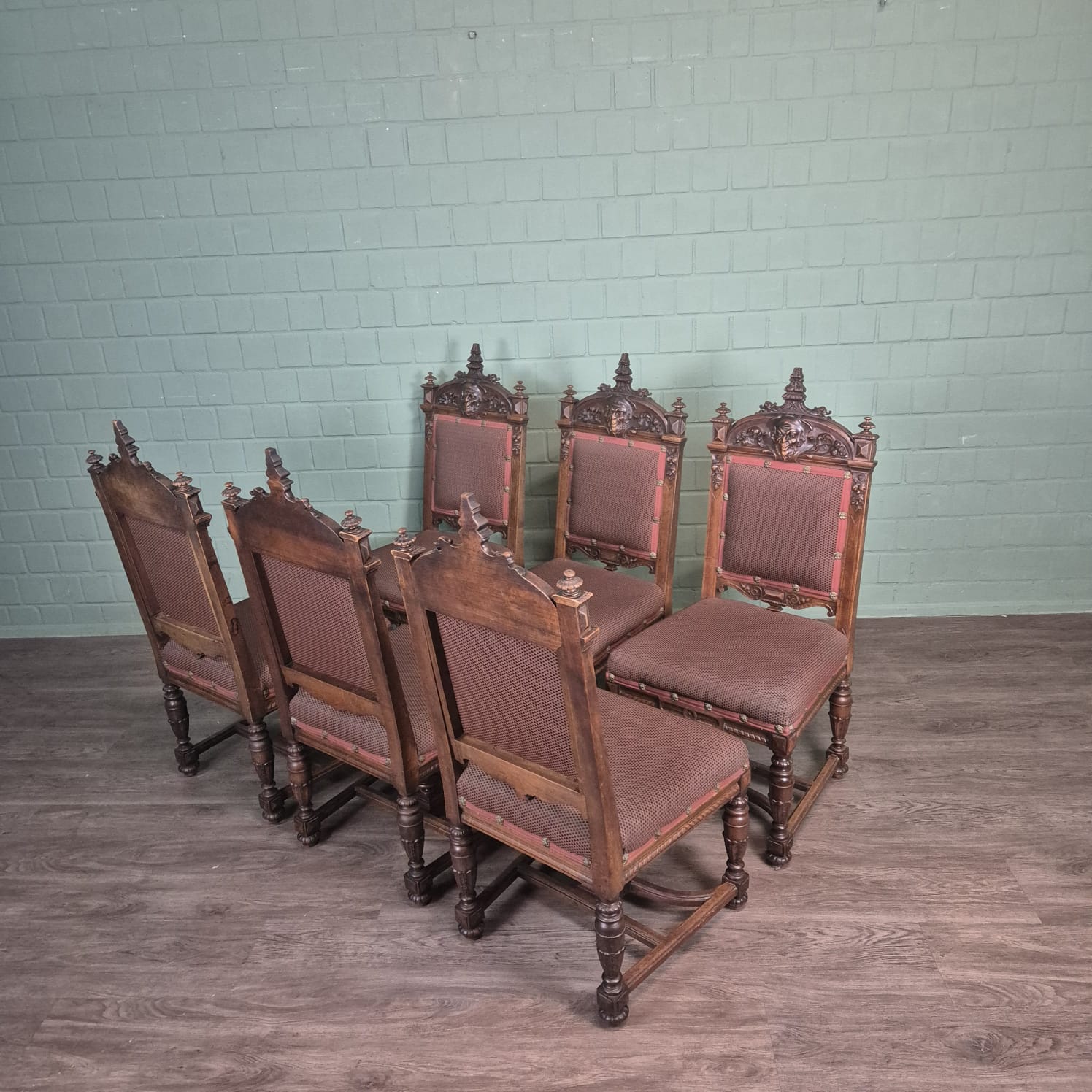 De zittingen, ongeveer vijf jaar geleden opnieuw gestoffeerd, zijn bekleed met een hoogwaardige stof die perfect past bij de warme eikenhouten tint en een luxueuze uitstraling uitstraalt. Hoewel ze antiek zijn, verkeren de stoelen in goede, goed onderhouden staat met slechts lichte sporen van ouderdomsslijtage die hun authenticiteit benadrukken.