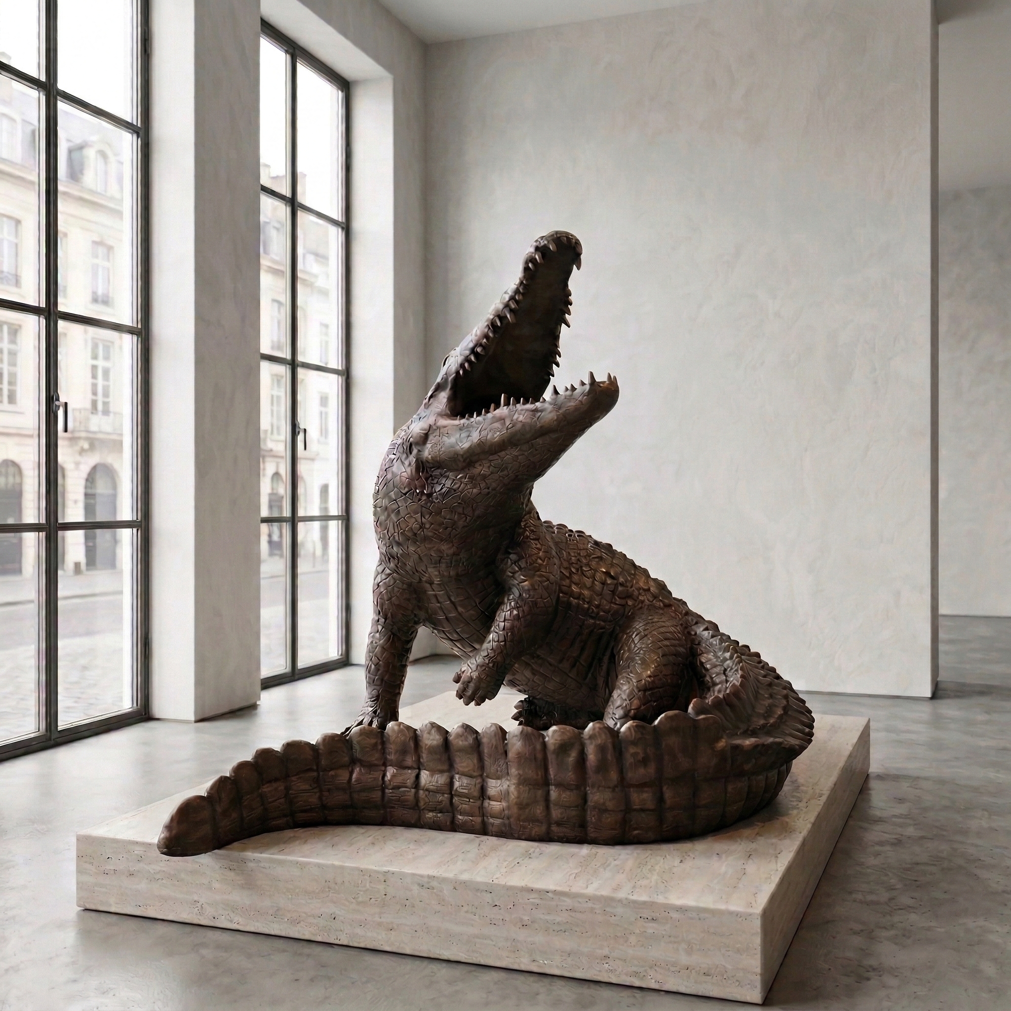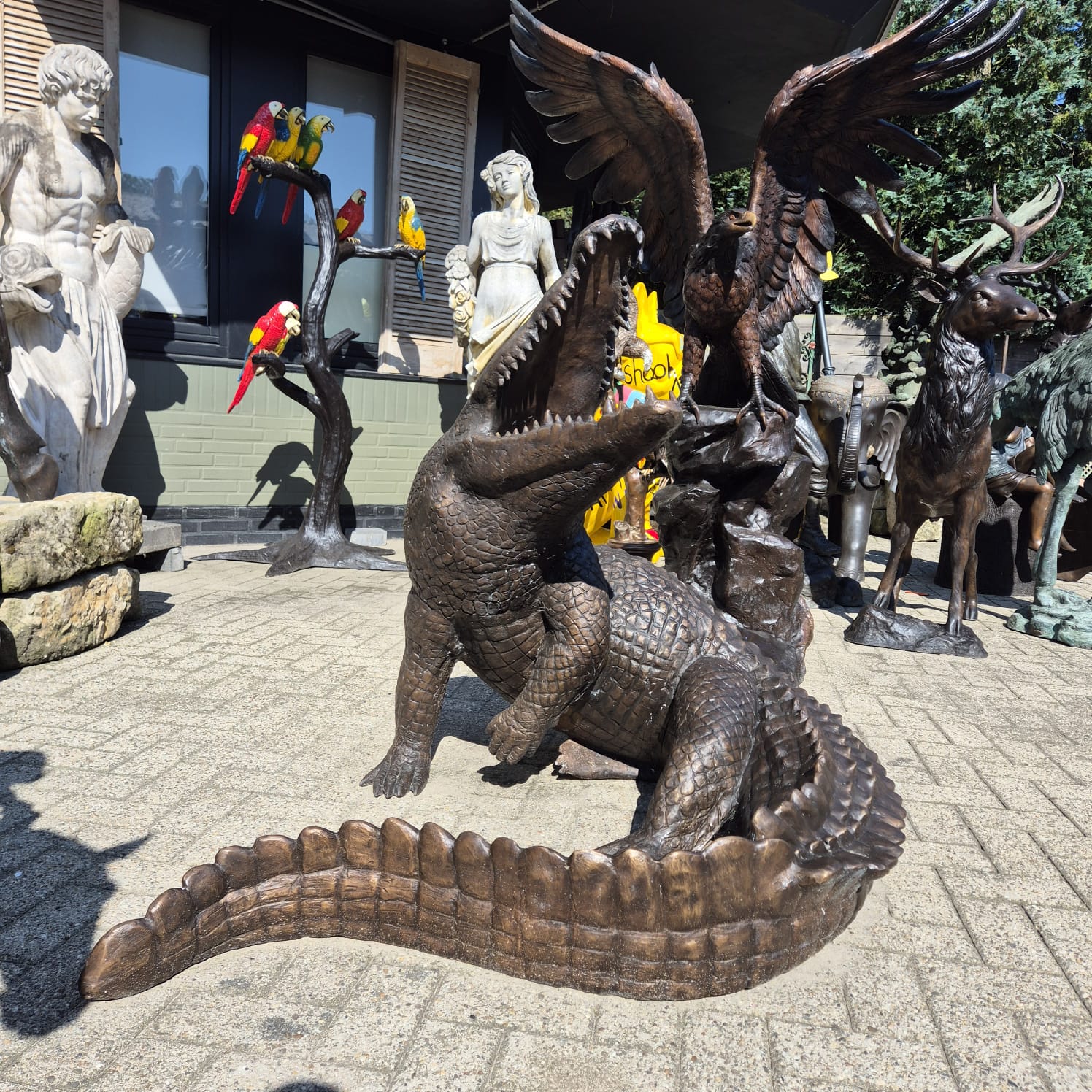 Detailgetreue und formschöne Darstellung eines Krokodils aus Bronze.  Maße: Breite 1,37 mHöhe 1,07 mTiefe 1,10 m