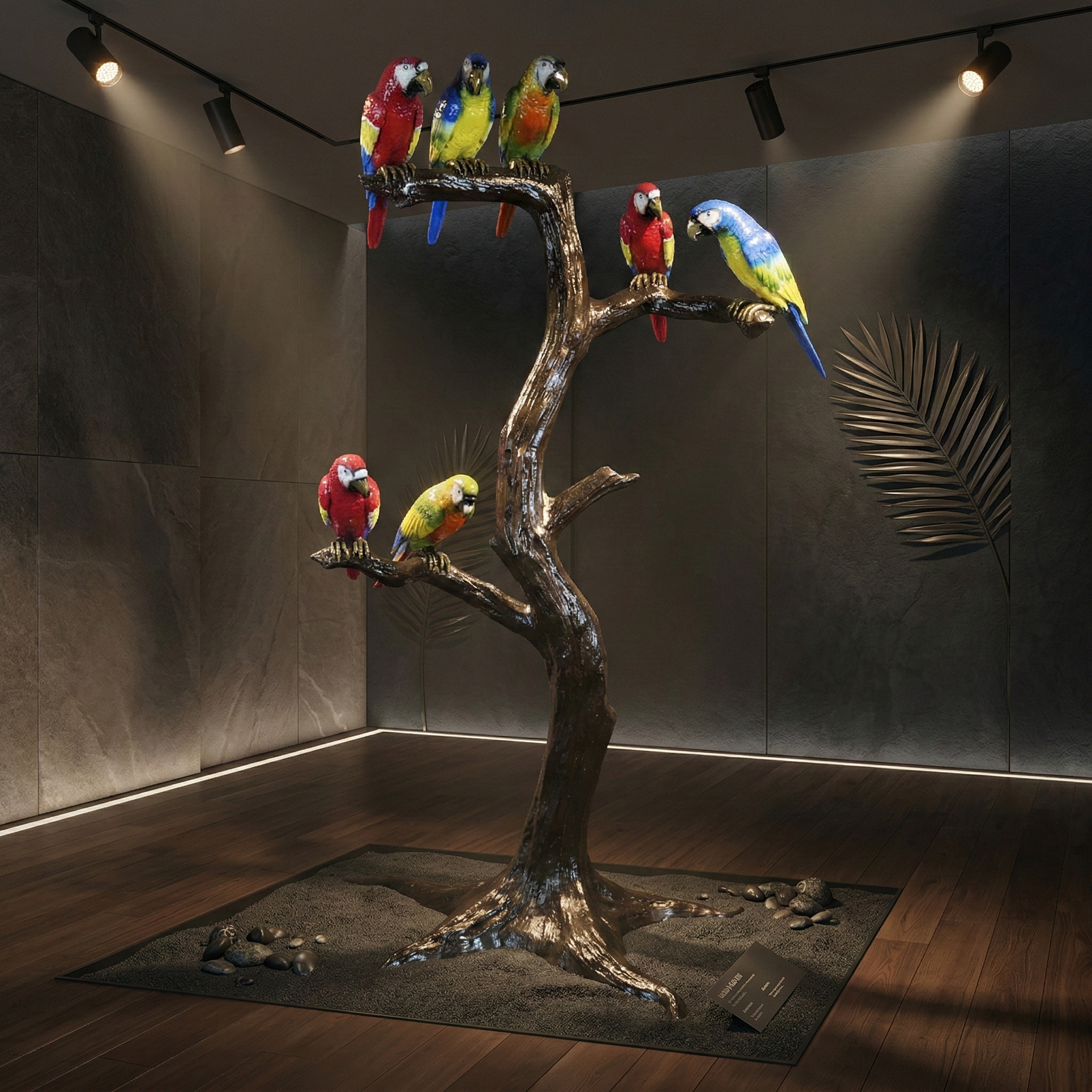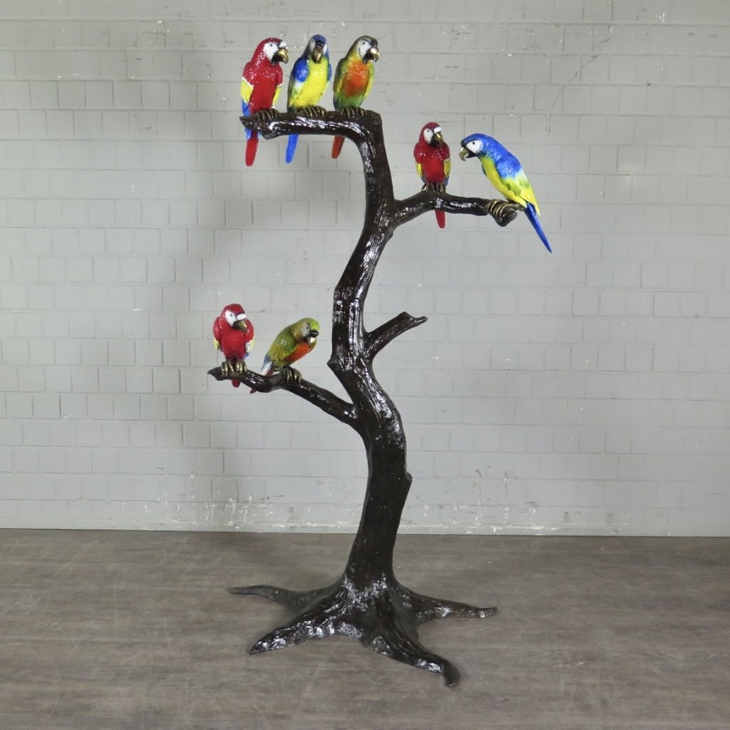 Detailgetreue und formschöne Darstellung von Ara Papageien auf einem Baum hergestellt aus Bronze. Maße: Breite 1,15 m Höhe 2,03 m Tiefe 0,97 m