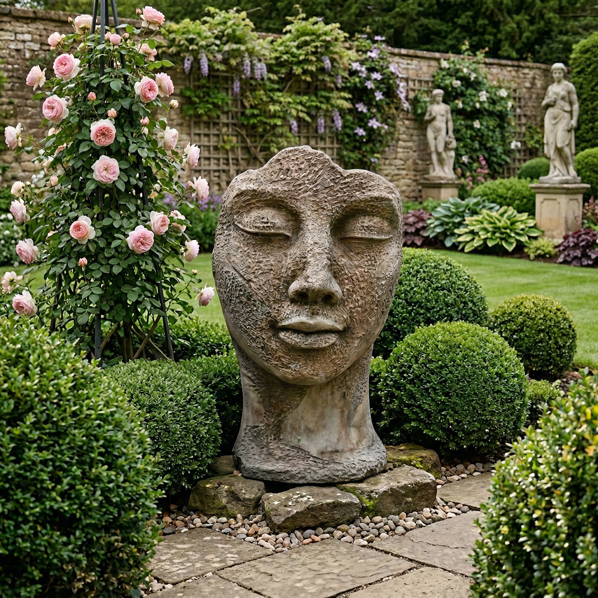 Majestätische Beton-Skulptur: Ruhende Seele – Einzigartiges Kunstwerk für Ihren Garten oder Innenbereich Erheben Sie Ihren Garten oder Wohnraum mit dieser atemberaubenden Beton-Skulptur auf ein neues Niveau. Die Skulptur zeigt ein in sich gekehrtes, friedliches Gesicht mit geschlossenen Augen, das Ruhe und Kontemplation ausstrahlt.   Maße:   Breite 0,75 m Höhe 1,15 m Tiefe 0,62 m