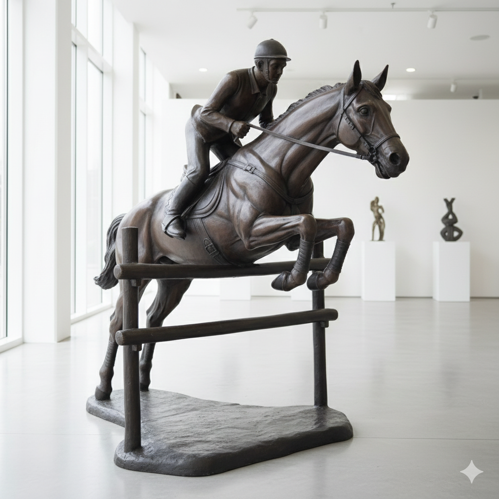 Detailgetreue und formschöne Darstellung von einem Springreiter mit Pferd hergestellt aus Bronze.   Maße:   Breite 1,10 m Höhe 1,50 m Tiefe 1,80 m