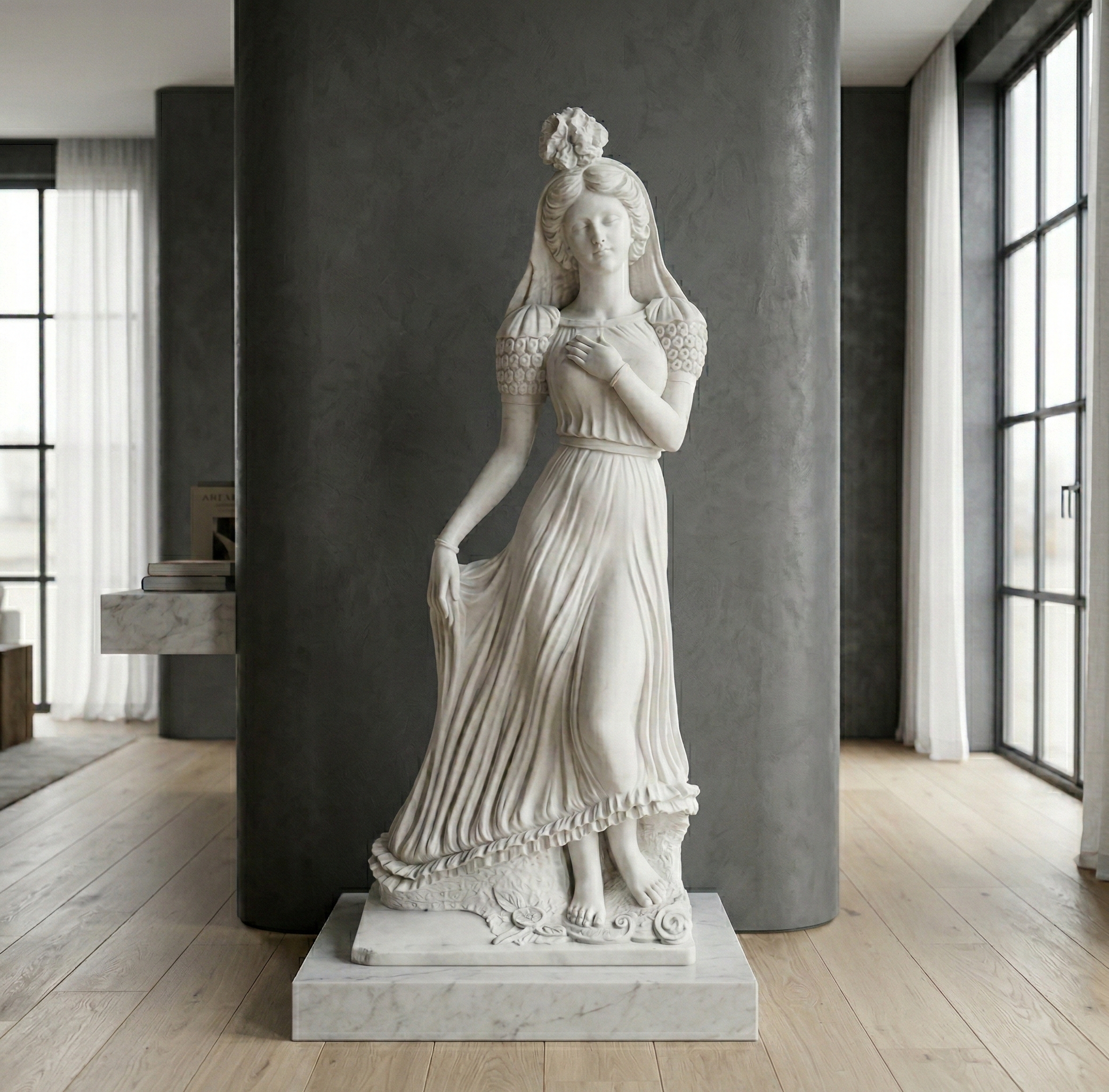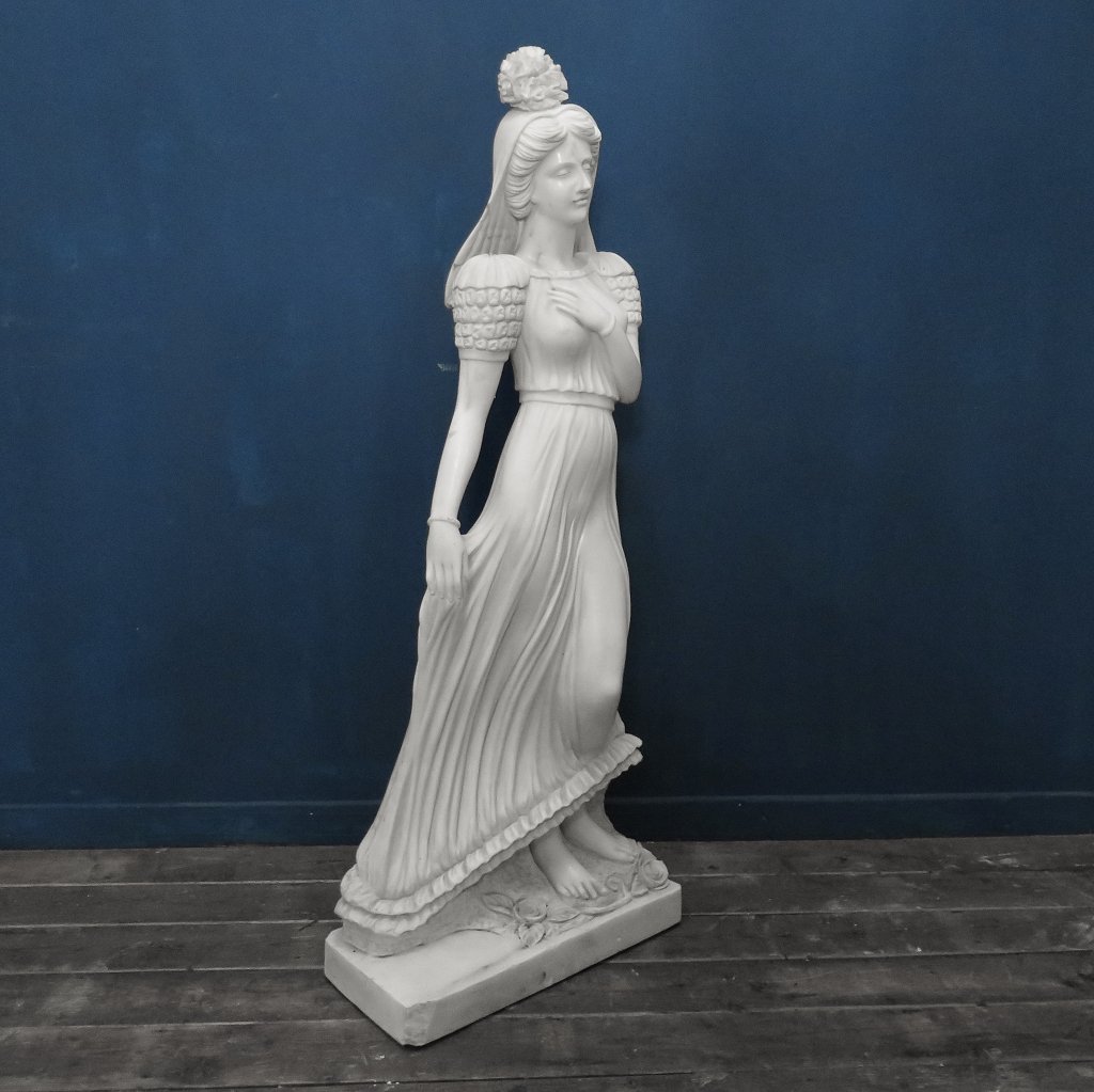 Stilvolle aus Marmor gefertigte Skulptur mit der Darstellung einer Frau.  Maße: Breite 0,57 m Höhe 1,42 m Tiefe 0,30 m