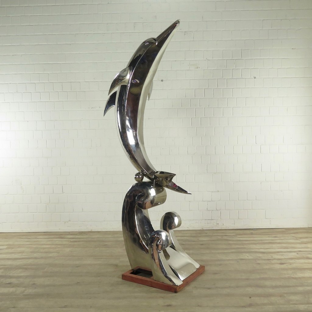Stilvoll gestaltete Skulptur aus Chrom mit der Darstellung eines Delphines. Maße: Breite 0,70 m Höhe 2,33 m Tiefe 0,90 m