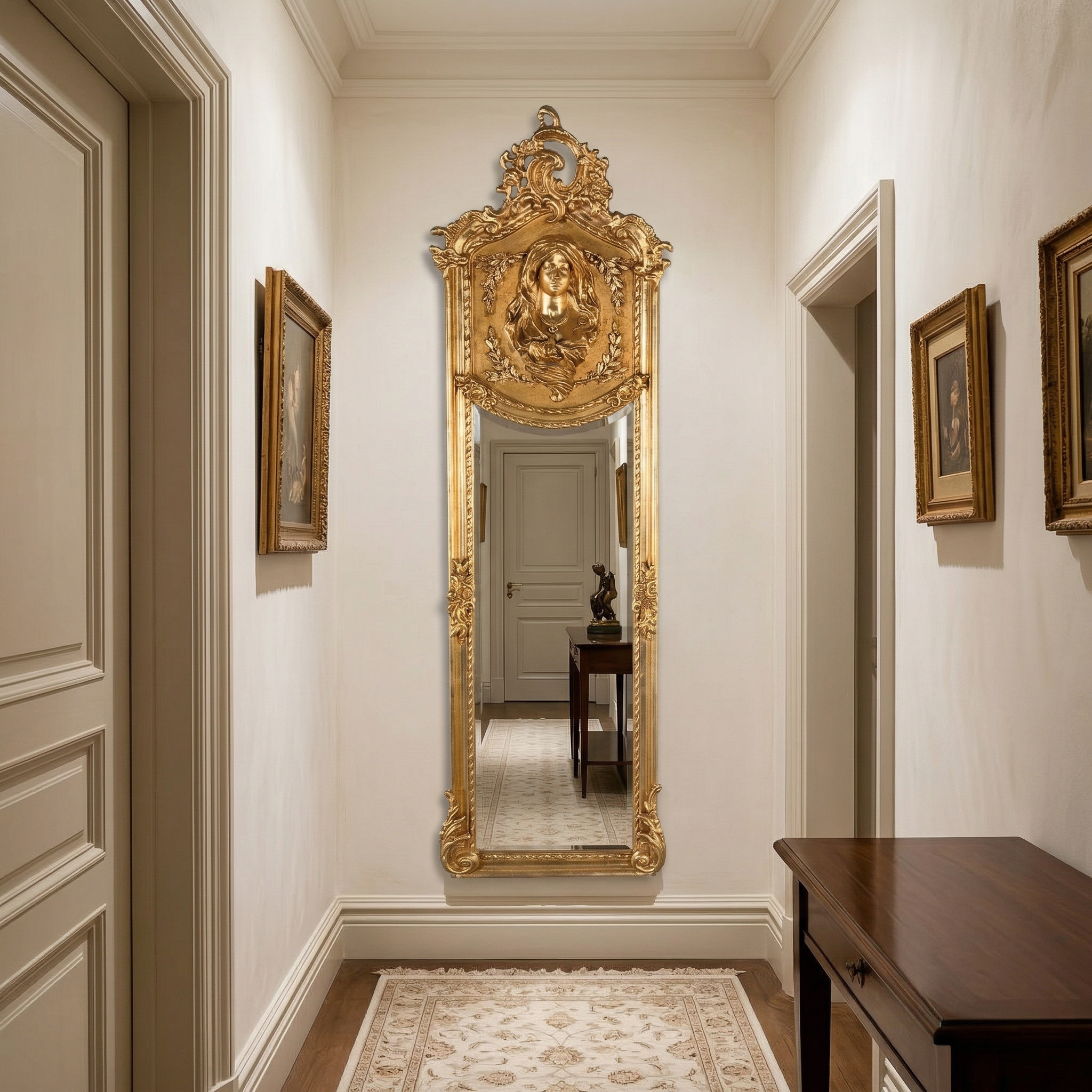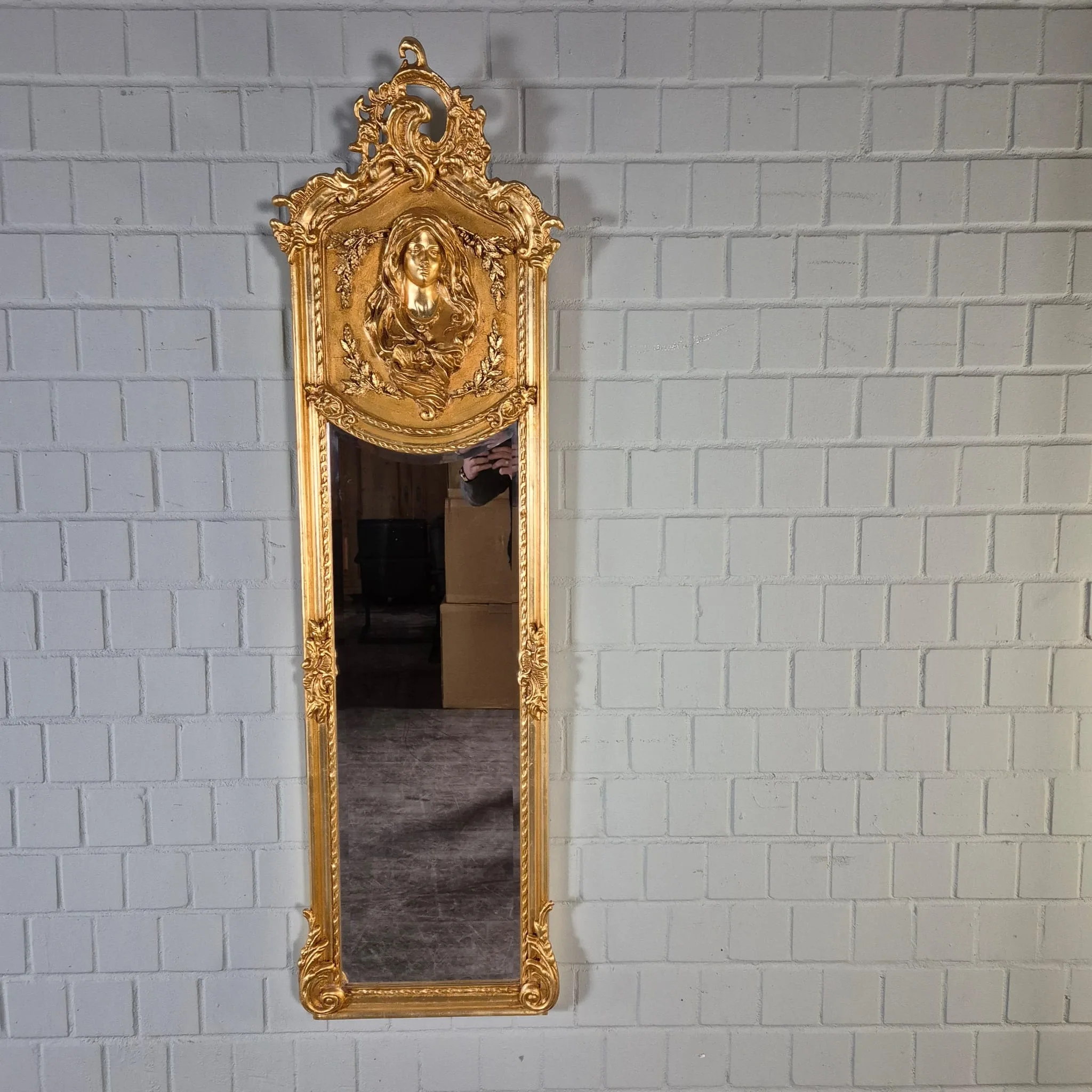 Aufwendig gestalteter Wandspiegel mit Facettenschliff. Der im Barockstil gestaltete Rahmen wurde aus Massivholz hergestellt.   Farbton: Gold   Abmessung Rahmen:   Breite 0,48 m Höhe 1,00 m