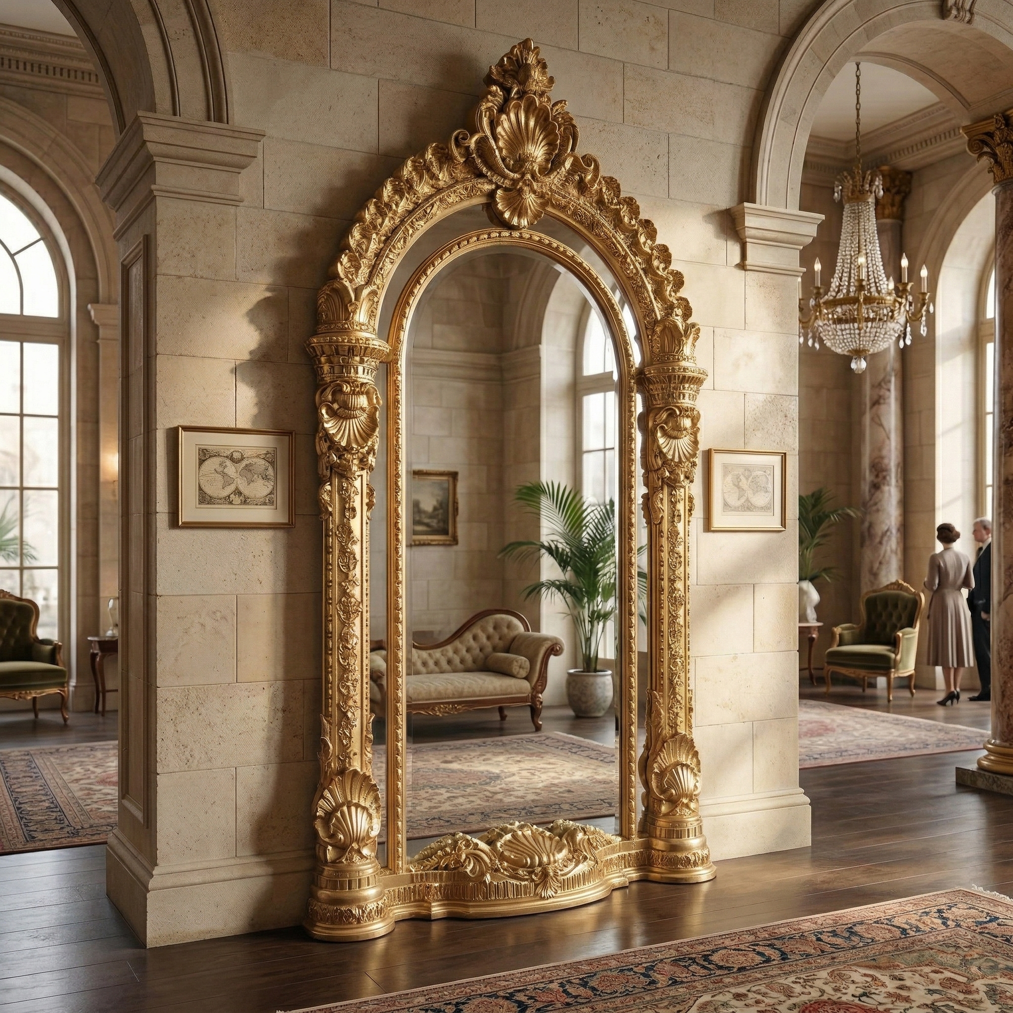 Aufwendig gestalteter Wandspiegel mit Facettenschliff. Der im Barockstil gestaltete Rahmen wurde aus Massivholz hergestellt.   Farbton: Gold, patiniert   Abmessung Rahmen:   Breite 1,40 m Höhe 2,50 m Tiefe 0,25 m