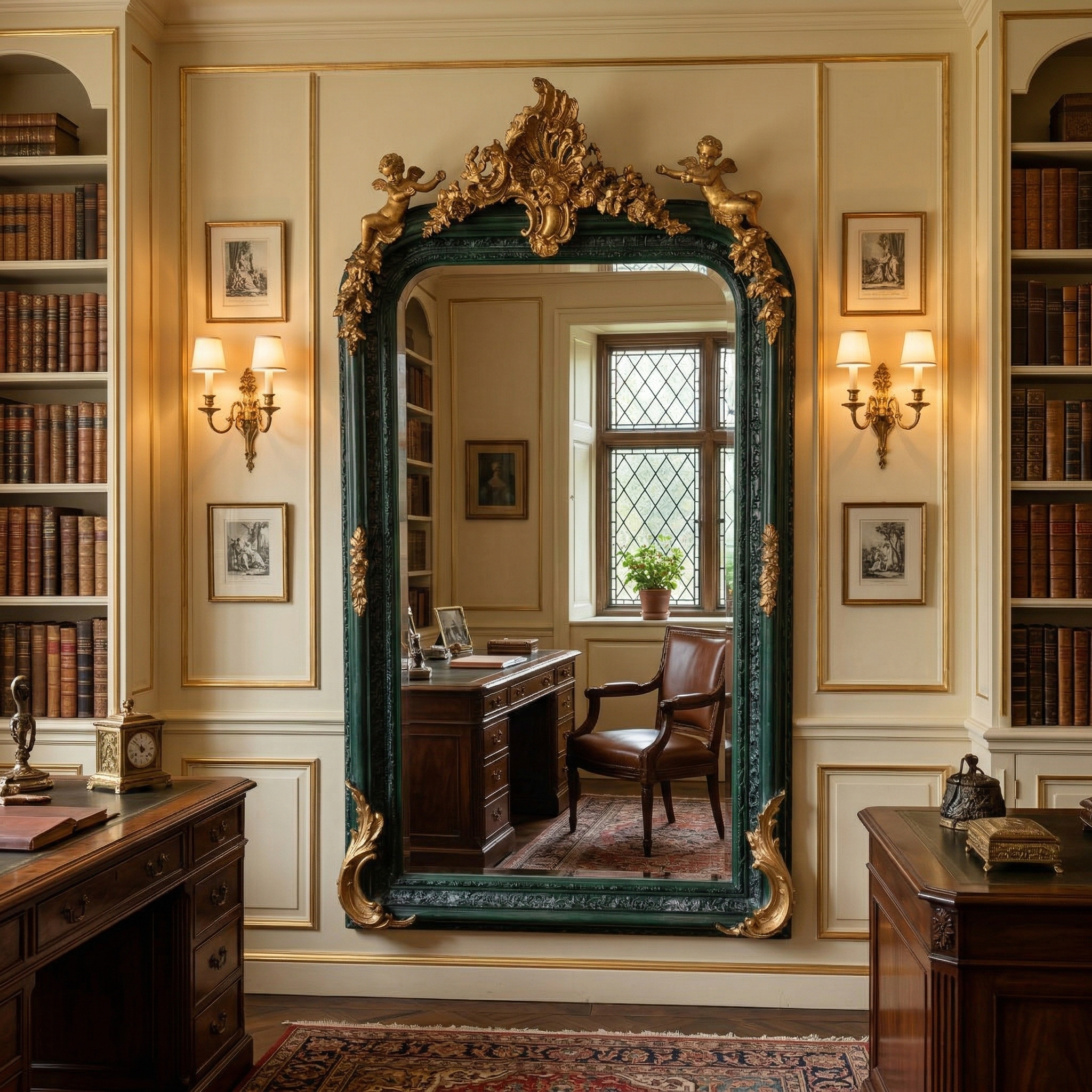 Aufwendig gestalteter Wandspiegel mit Facettenschliff. Der im Barockstil gestaltete Rahmen wurde aus Massivholz hergestellt.   Farbton: Grün-Gold    Abmessung Rahmen:   Breite 0,96 m Höhe 1,60 m Tiefe 0,09 m