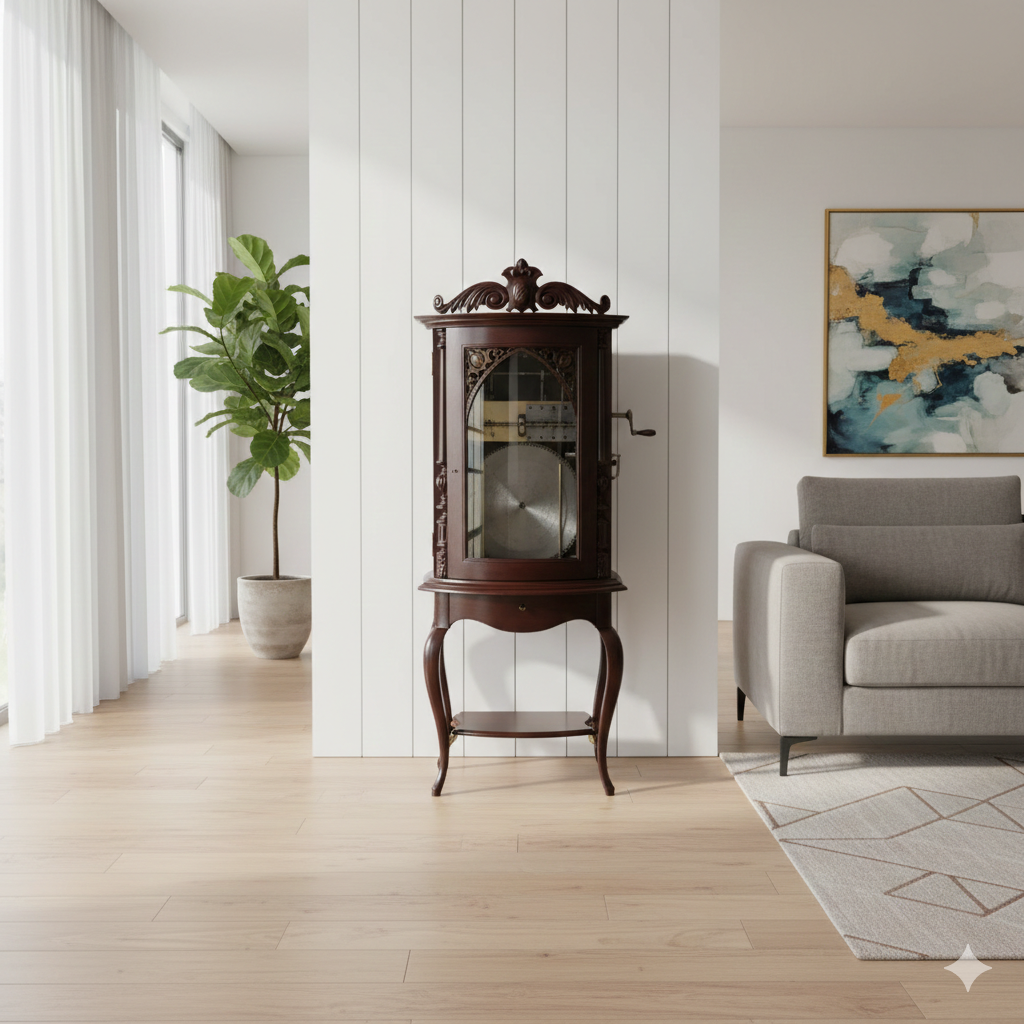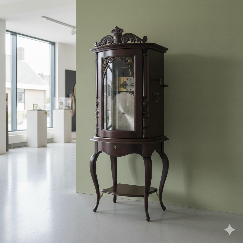 Im Originalzustand stehende Gründerzeit Regina Spieluhr aus massiv Mahagoni von 1894. Die funktionstüchtige Spieluhr mit Plattenwechsler befindet sich in einem sehr guten Zustand und weist nur minimale Gebrauchsspuren auf. Der aus massiv Mahagoni hergestellte Schrank befindet sich ebenfalls in einem sehr guten Zustand und weist nur minimale Gebrauchsspuren auf. Zerlegbar (2-teilig).   Regina Music Box … Weiterlesen
