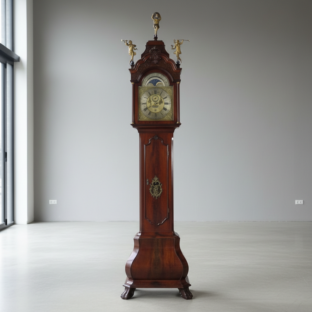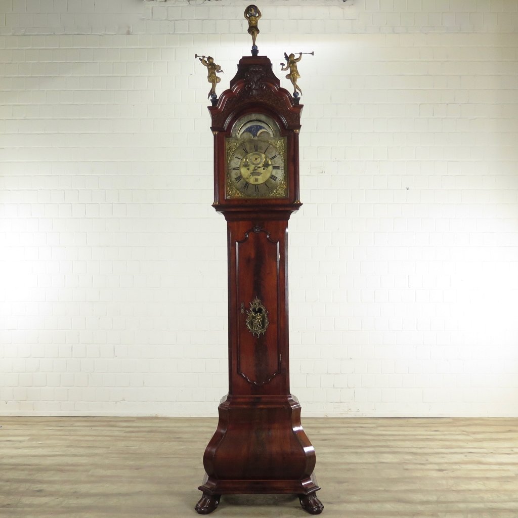 Im Originalzustand stehende Amsterdamer Standuhr von ca. 1760. Die mit Kalender und Mondphase versehene Uhr ist zudem mit Sekundenzeiger ausgestattet. Das Uhrwerk befindet sich in einem dezent verzierten Korpus welcher in Mahagoni auf massiv Eiche furniert wurde. Viertelschlag auf doppelter Glocke. Die Uhr wurde signiert mit Jacob Tyse (Tijse). Maße: Breite 0,70 mHöhe 2,90 mTiefe … Weiterlesen