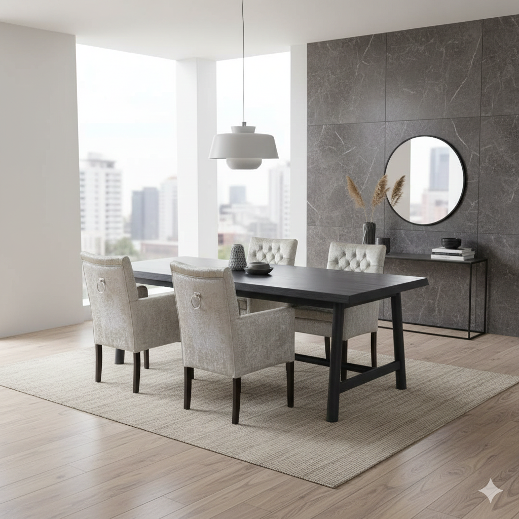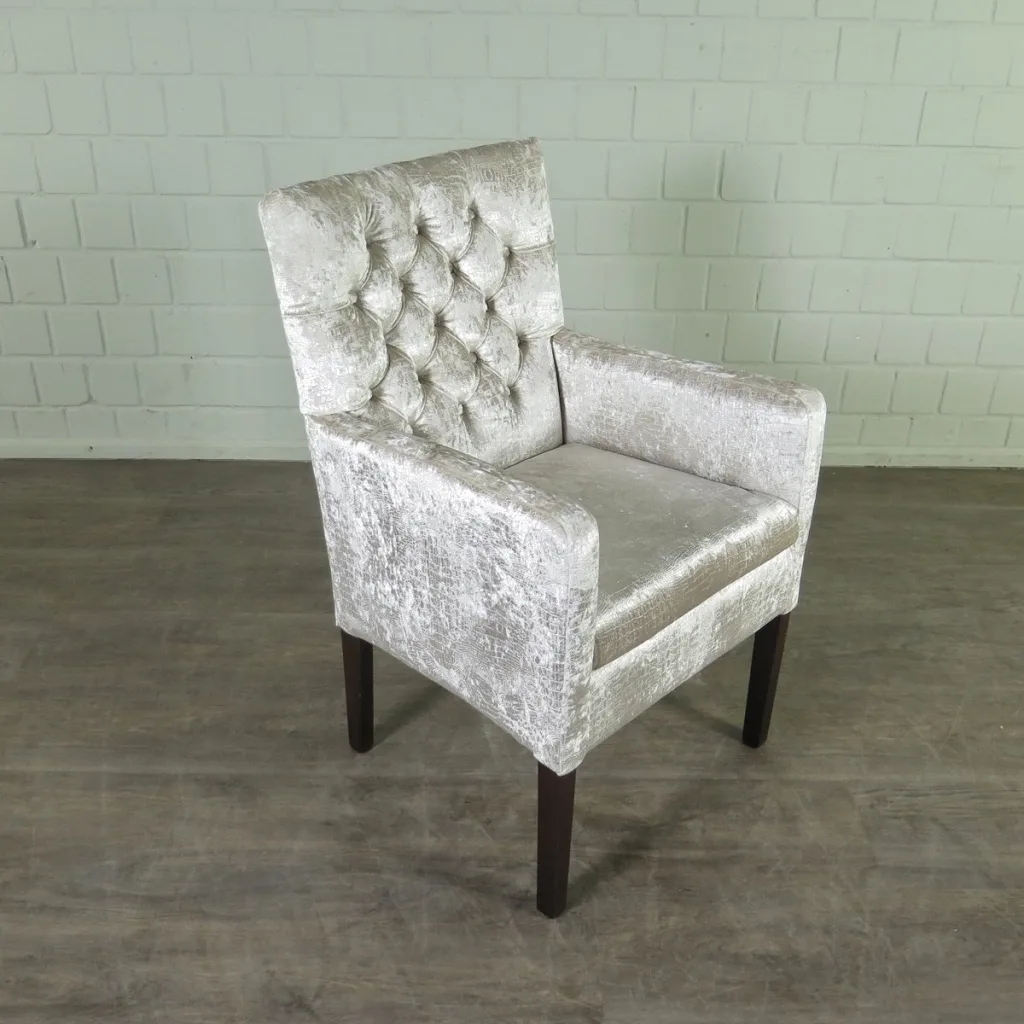 Dieser bequeme Stuhl mit Armlehnen ist mit einem pflegeleichten Bezug in Krokodiloptik bezogen. Er ist sowohl als Küchen- oder Esszimmerstuhl geeignet. Stückpreis. Breite 0,58 mHöhe 0,92 mTiefe 0,56 mSitzhöhe 0,50 m Höhe Armlehne 0,66 m