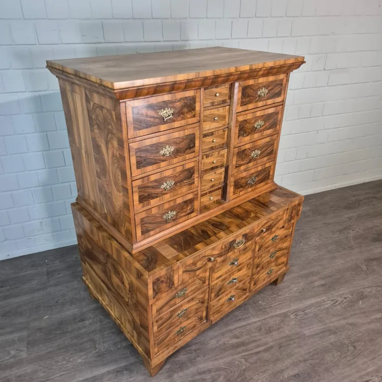 Restaurierter Tabernakel Kabinettschrank in Nussbaum furniert und von Grund auf Schellack poliert von ca. 1800. Der im Barockstil gestaltete Schrank befindet sich in einem sehr guten Zustand und weist nur minimale Gebrauchsspuren auf. Zerlegbar (2-teilig).   • 24 Schubladen• Nussbaum Furnier• Schellack • zerlegbar• Barockstil ca. 1800 Maße: Breite 1,09 mHöhe 1,44 mTiefe 0,63 m – … Weiterlesen