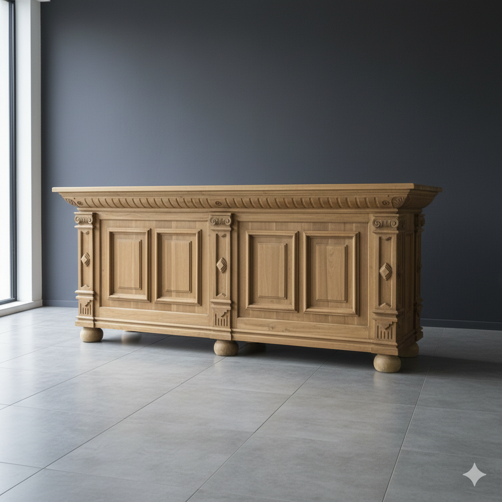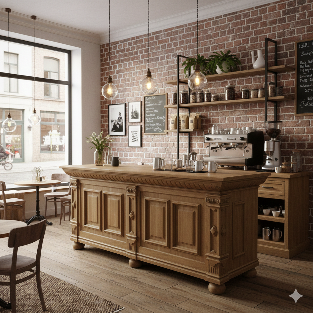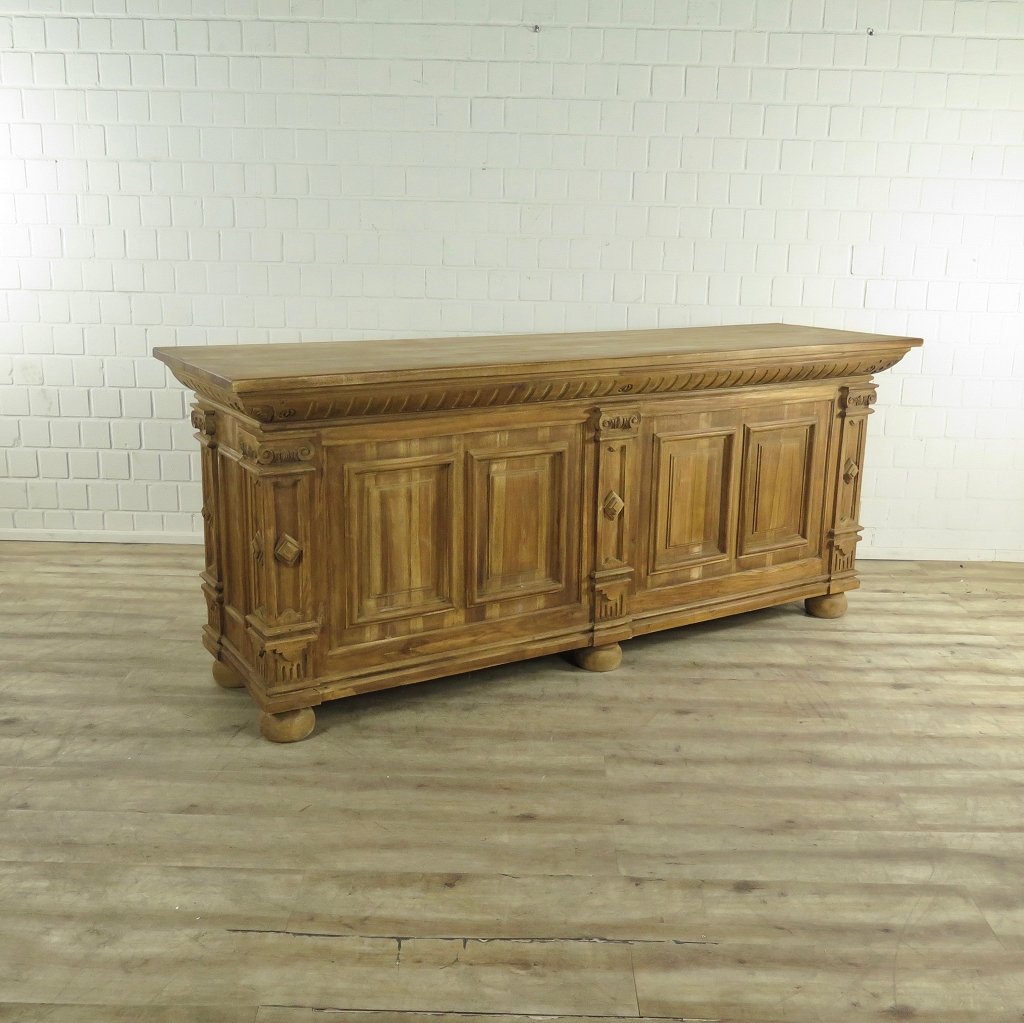 Diese stilvoll gestaltete Theke aus massiv Teak (Hartholz) erhält ihre besondere Wirkung durch minimale Unregelmäßigkeiten im Holz. Diese entstehen durch das verwendete Edelholz mit seinen verschiedenen Farben und Strukturen, welche diesem Stück einen eigentümlichen Charakter verleihen und es zu einem Unikat machen. Maserung und Farbton des Holzes tragen sehr zum optischen Wert dieses Möbels bei, das sowohl dekorative Möglichkeiten als auch genügend Stauraum bietet. Die Kombination von nostalgischer Optik und moderner Funktionalität ist für alle Ladeneinrichtungen sowie vielen weiteren Einsatzgebieten geeignet.