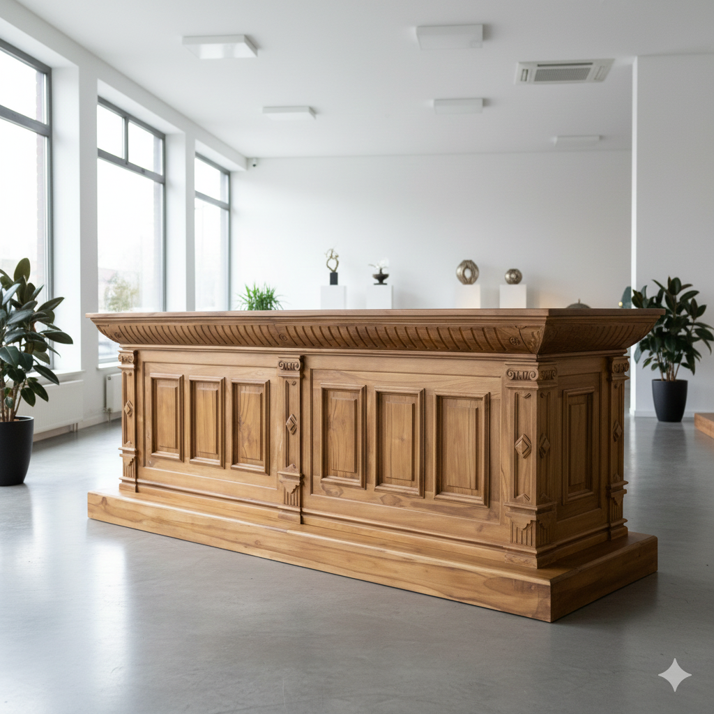 Der Tresen Modell Bella aus massiv Teak (Hartholz) besticht durch seine stilvolle Eleganz und der aufwendigen Verarbeitung. Die Kombination von nostalgischer Optik und moderner Funktionalität ist für alle Ladeneinrichtungen sowie vielen weiteren Einsatzgebieten geeignet. Der Tresen wird komplett fertig montiert geliefert und ist somit sofort einsatzbereit.
