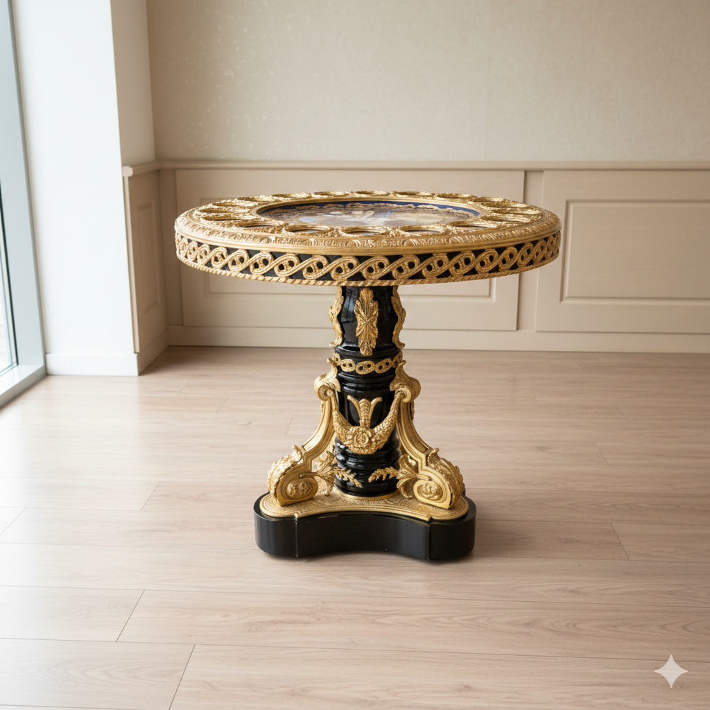 Dieser stilvoll gestaltete Tisch aus Bronze und Porzellan in barocker Optik erhält seine besondere Wirkung durch die aufwendige Verarbeitung und den stilvollen Verzierungen.