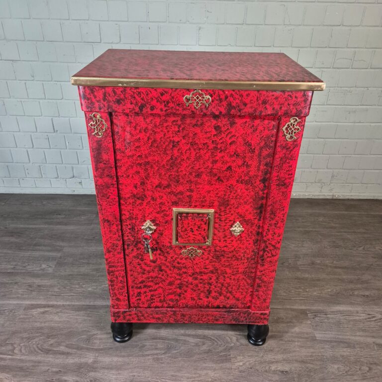 Restaurierter Gründerzeit Tresor von ca. 1880. Der mit Zahlenschloss ausgestattete Panzerschrank befindet sich in einem guten Zustand und weist nur leichte Gebrauchsspuren auf. Gewicht ca. 450 Kilogramm. Inklusive Schlüssel. Maße: Breite 0,78 mHöhe 1,28 mTiefe 0,54 m   Bitte beachten Sie, dass dieser Artikel der Sonderregelung für Sammlungsstücke und Antiquitäten unterliegt (Differenzbesteuerung). Unternehmer können aus … Weiterlesen