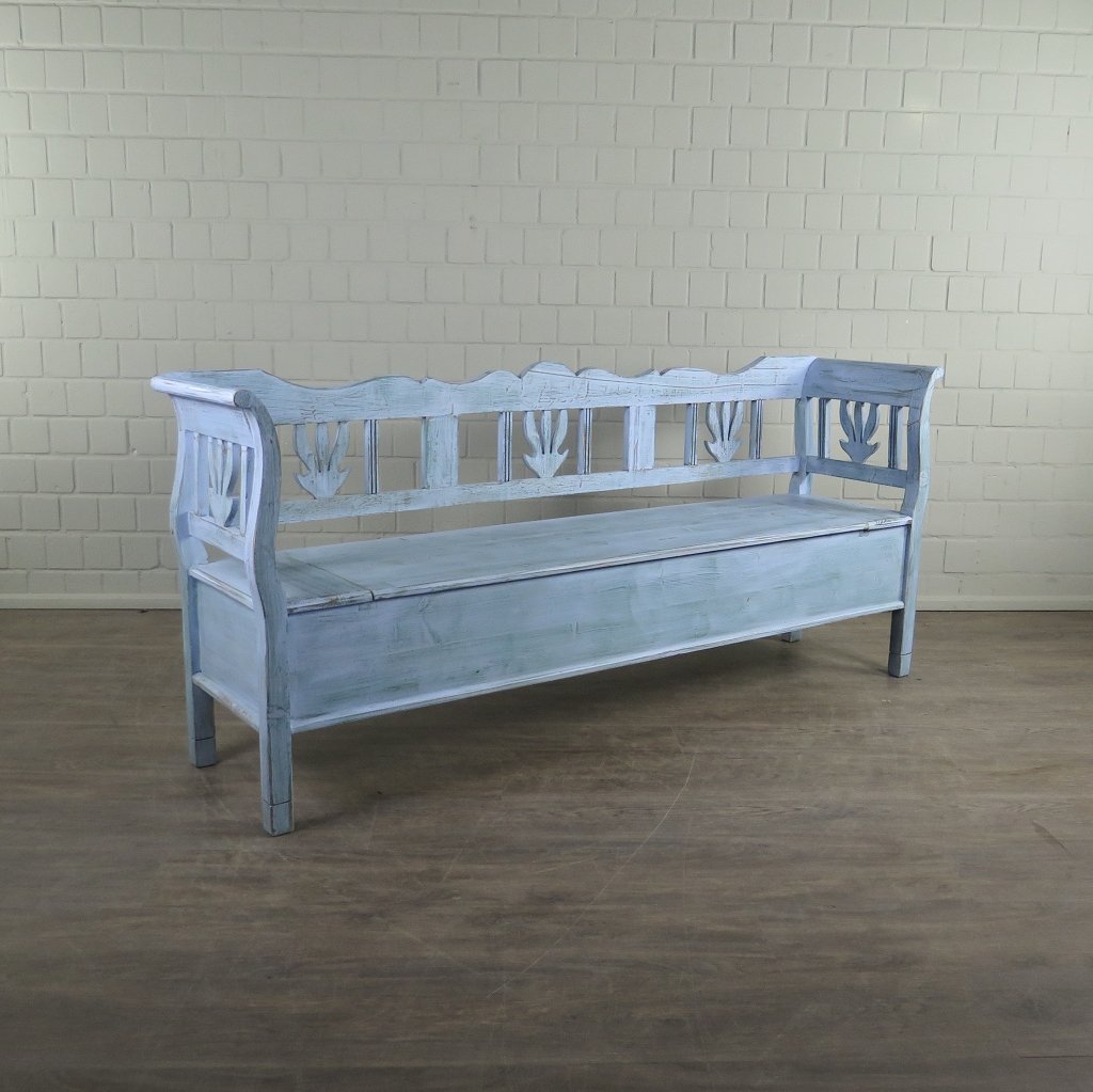 Stilvolle Truhenbank im Gründerzeitstil. Edel-rustikales Stück aus massiv Kiefer. Die Truhenbank befindet sich in einem guten Zustand und weist nur geringe Gebrauchsspuren auf.  Farbton: Blau-Grün in Shabby-Chic Optik lackiert Maße: Länge 2,09 m Breite 0,48 m Höhe 0,91 mSitzhöhe 0,50 m