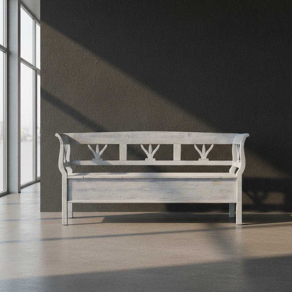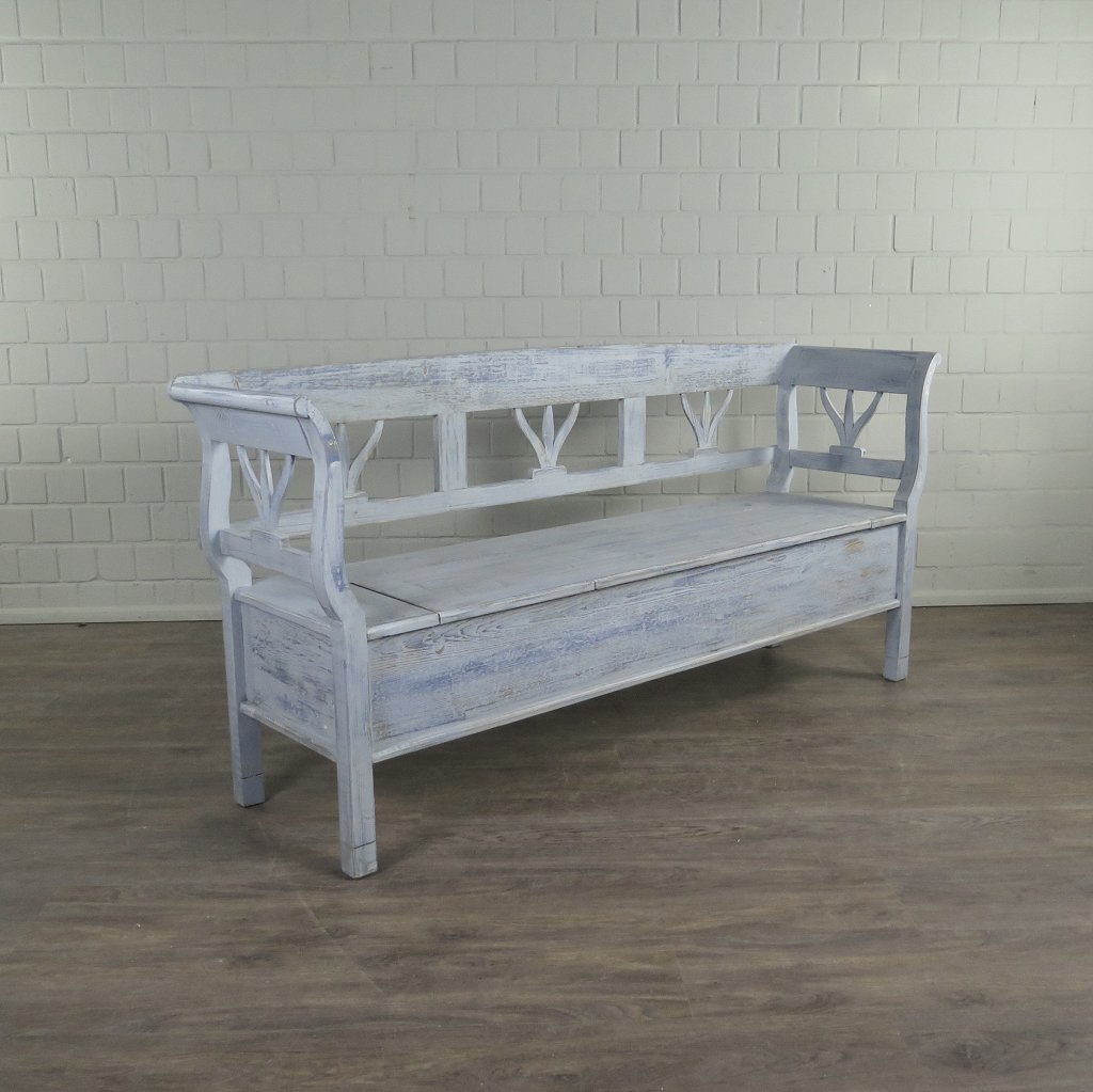 Stilvolle Truhenbank im Gründerzeitstil. Edel-rustikales Stück aus massiv Kiefer. Die Truhenbank befindet sich in einem guten Zustand und weist nur geringe Gebrauchsspuren auf.  Farbton: Grau-Blau in Shabby-Chic Optik lackiert Maße: Länge 1,96 mBreite 0,50 mHöhe 0,93 mSitzhöhe 0,49 m