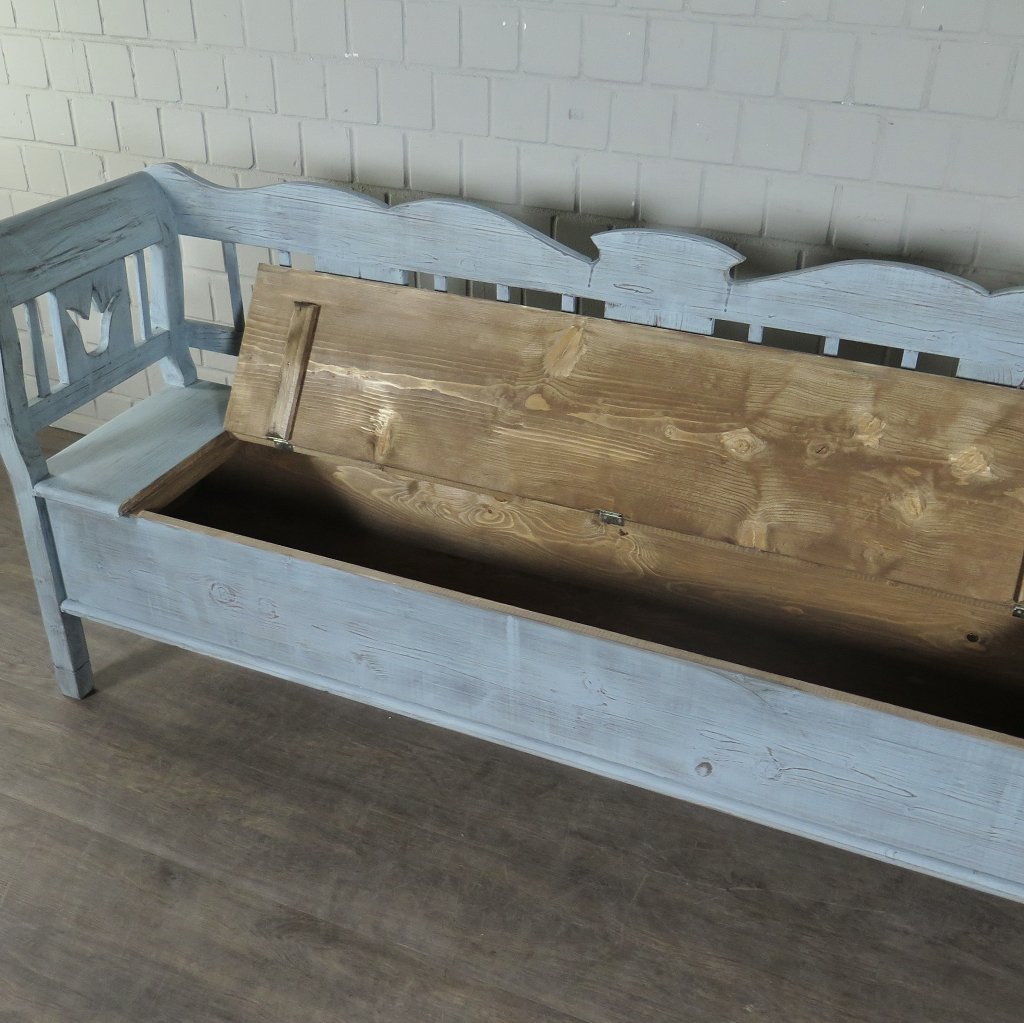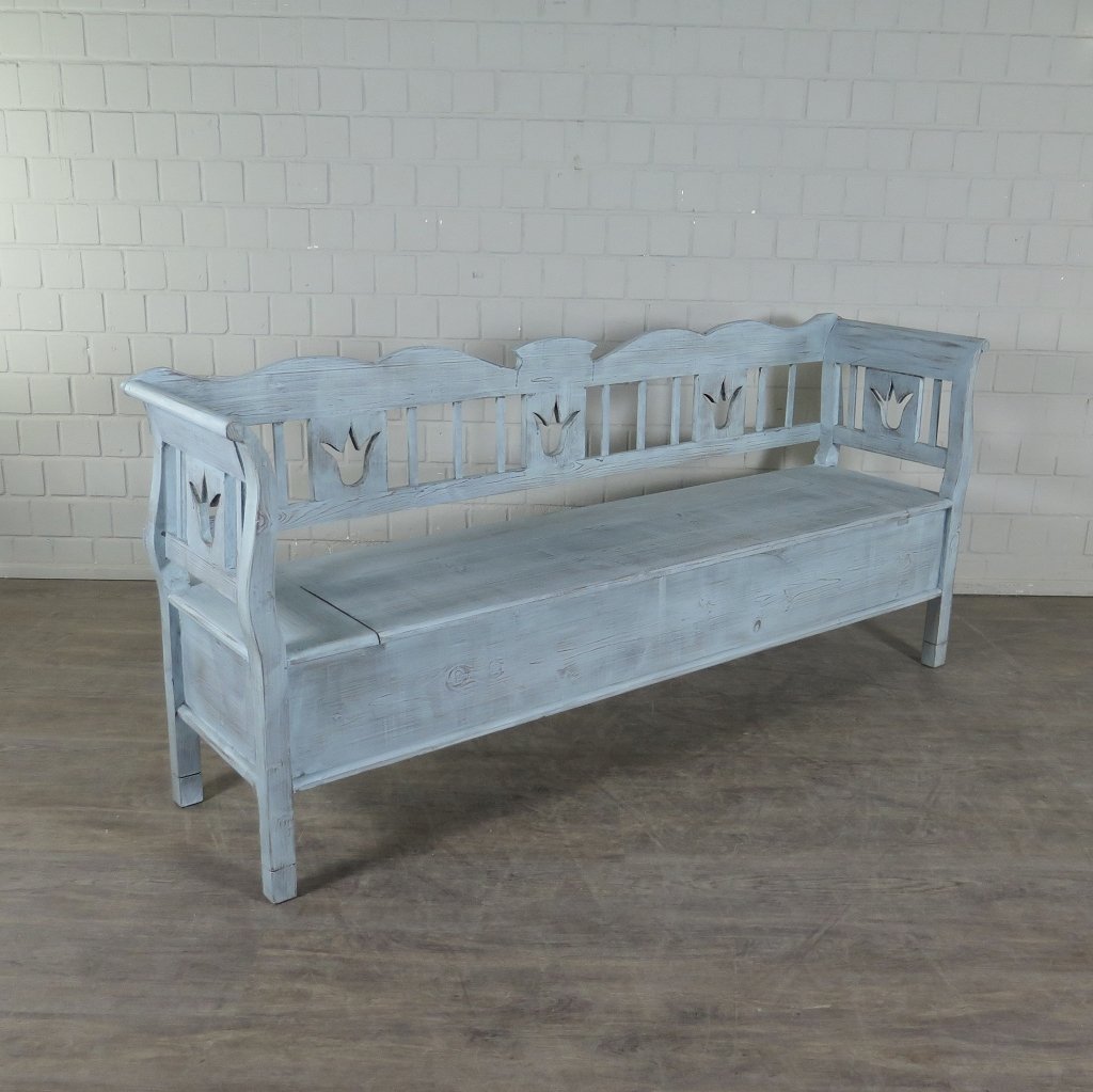 Stilvolle Truhenbank im Gründerzeitstil. Edel-rustikales Stück aus massiv Altkiefer. Die Truhenbank befindet sich in einem guten Zustand und weist nur geringe Gebrauchsspuren auf.  Farbton: Hellblau in Shabby-Chic Optik lackiert Maße: Länge 2,07 m Breite 0,50 m Höhe 0,92 mSitzhöhe 0,48 m