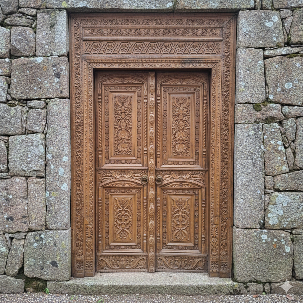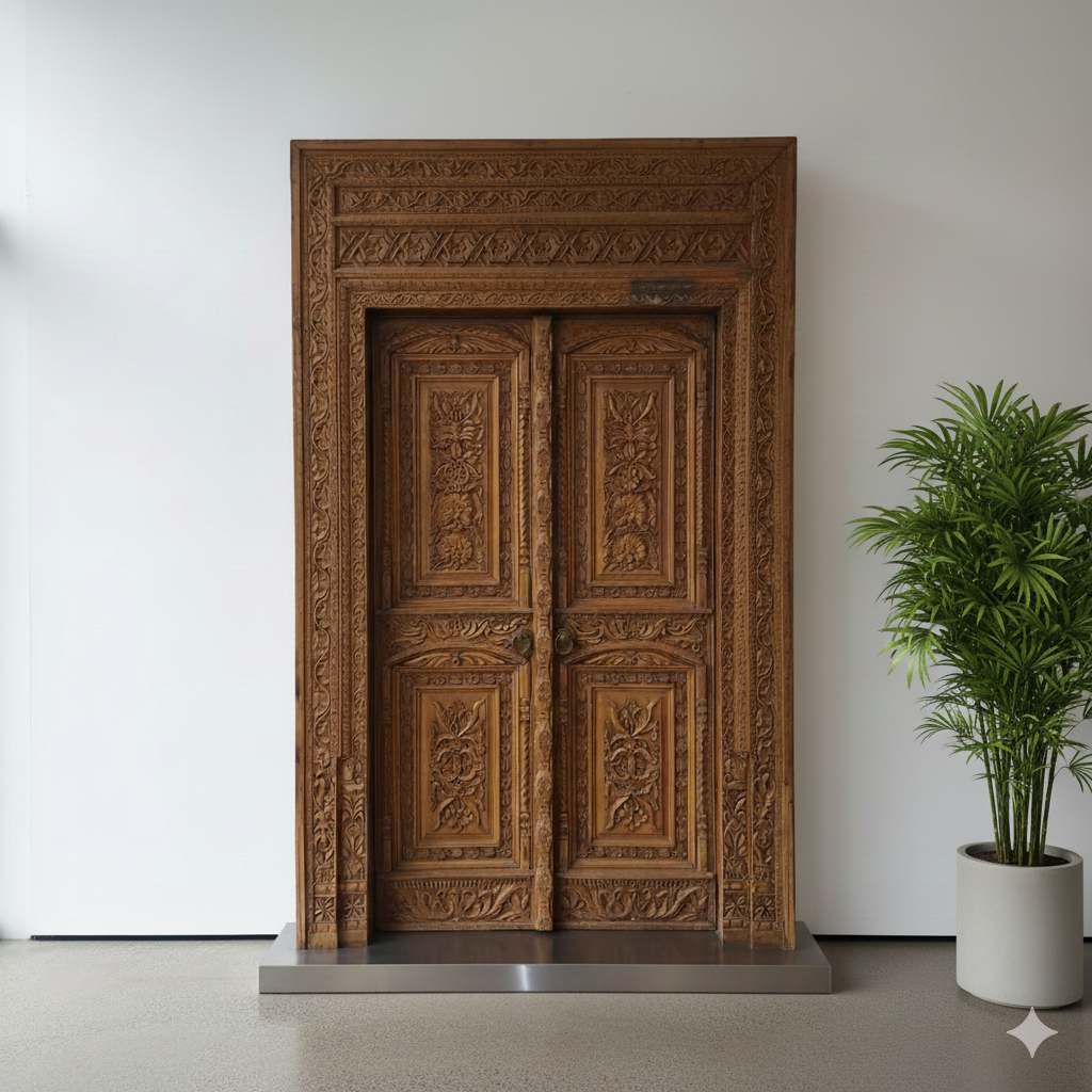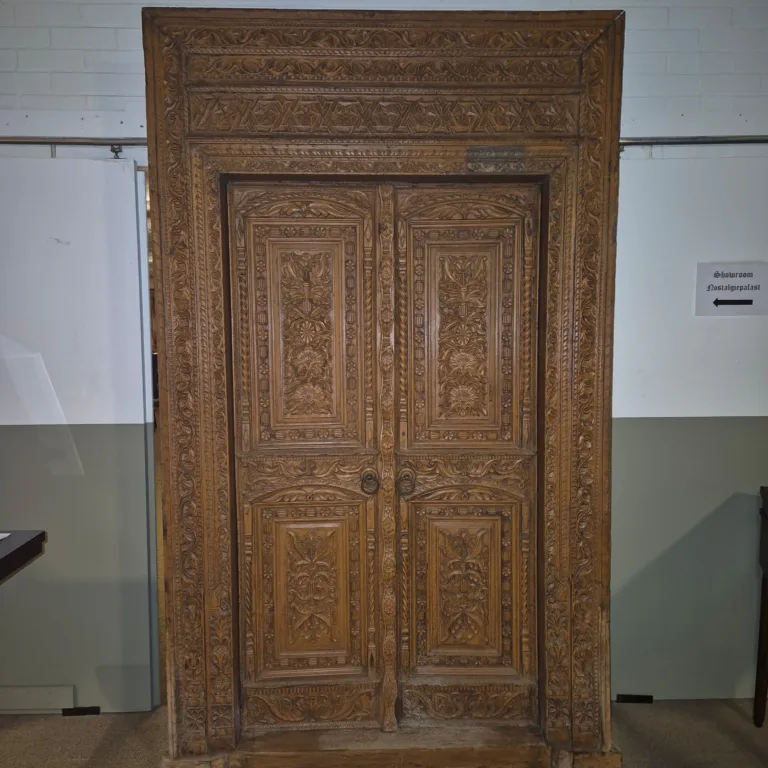 Im Originalzustand stehende Haustür (mit Rahmen) hergestellt aus massiv Teakholz von ca. 1850. Die mit aufwendigen Schnitzereien und den originalen Beschlägen versehene Tür befindet sich in einem guten Zustand und weist nur normale Gebrauchsspuren auf.  Maße: Breite 1,55 mHöhe 2,65 m