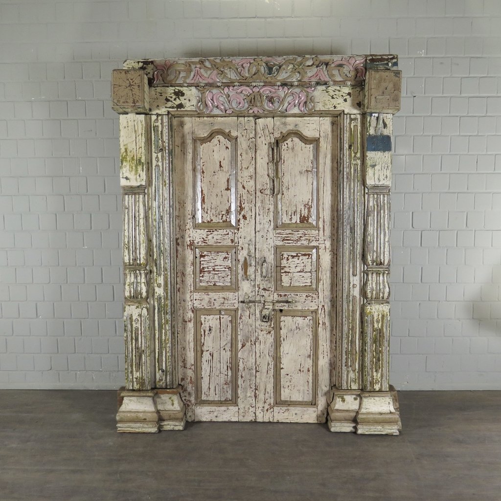 Im Originalzustand stehende Haustür hergestellt aus massiv Teakholz. Die mit den originalen Beschlägen versehene Tür befindet sich in einem guten Zustand und weist nur normale Gebrauchsspuren auf. Zerlegbar (8-teilig). Maße: Breite 1,63 m Höhe 2,25 mTiefe 0,71 m