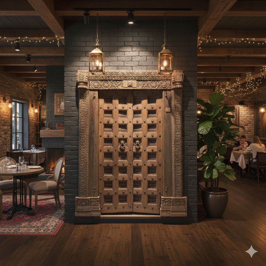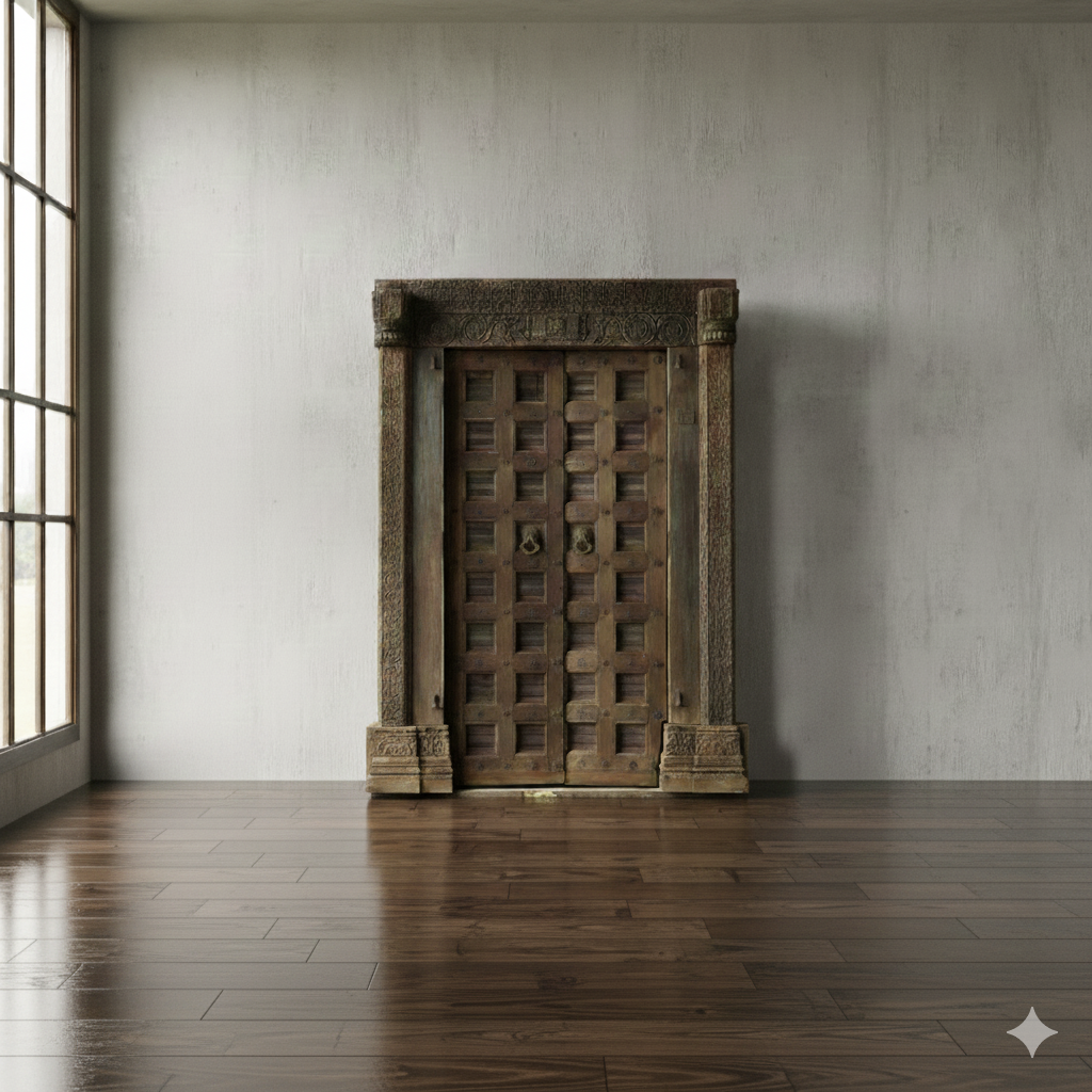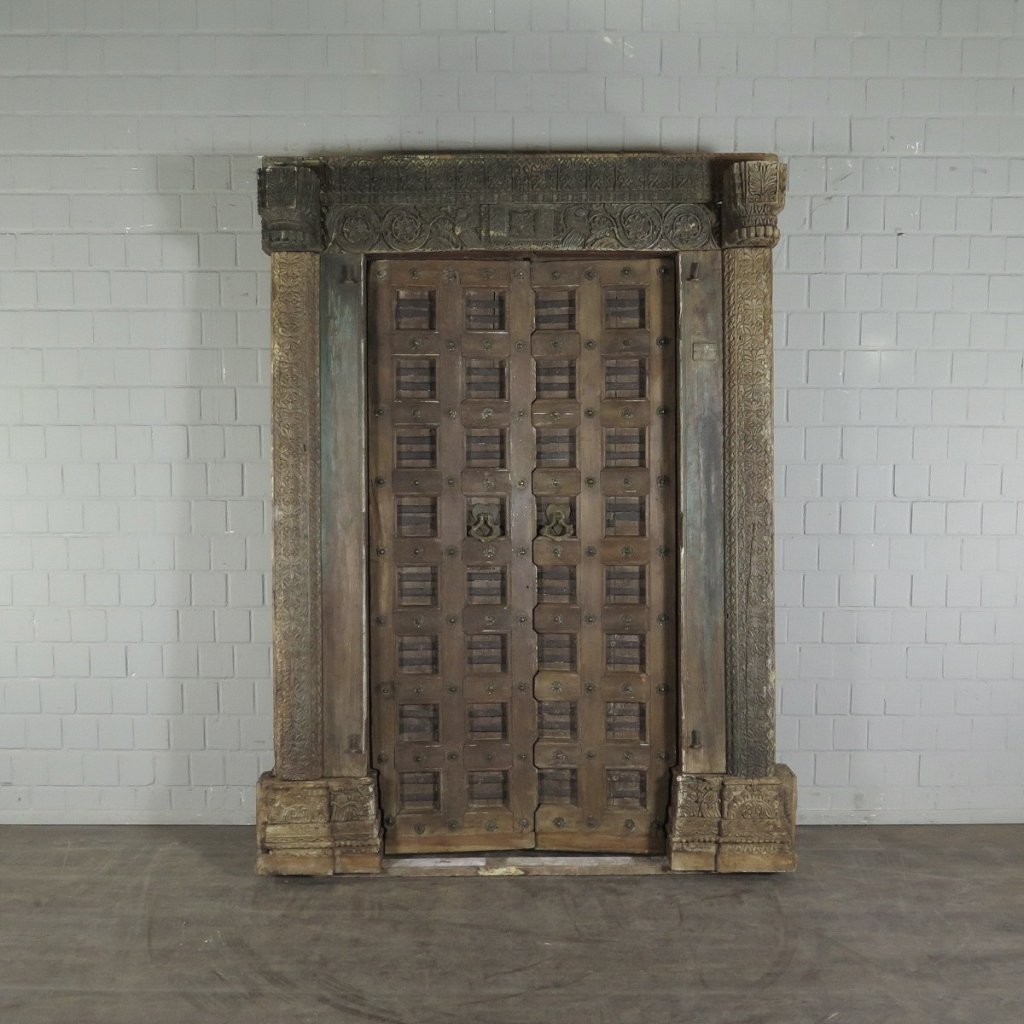 Im Originalzustand stehende Haustür (mit Rahmen) hergestellt aus massiv Teakholz von ca. 1920. Die mit den originalen Beschlägen und aufwendigen Verzierungen versehene Tür befindet sich in einem guten Zustand und weist nur normale Gebrauchsspuren auf Maße: Breite 1,72 m Höhe 2,27 mTiefe 0,50 m