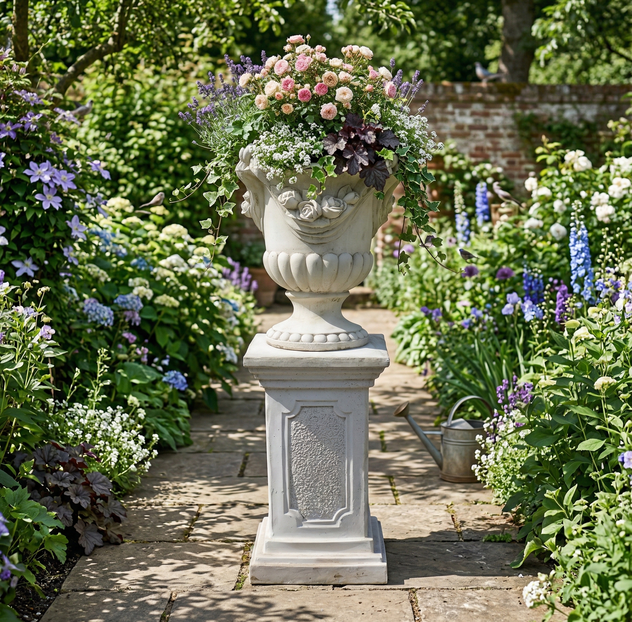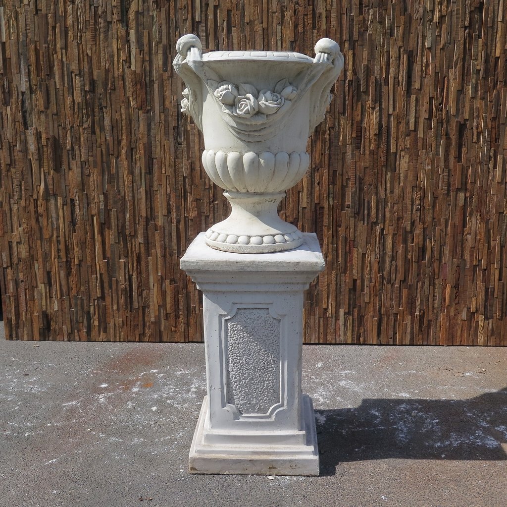 In nostalgischer Optik gestaltete Vase auf Sockel. Hergestellt aus Beton. Vase: Durchmesser 0,70 m Höhe 0,85 m Sockel: Breite 0,52 m Tiefe 0,52 m Höhe 0,85 m