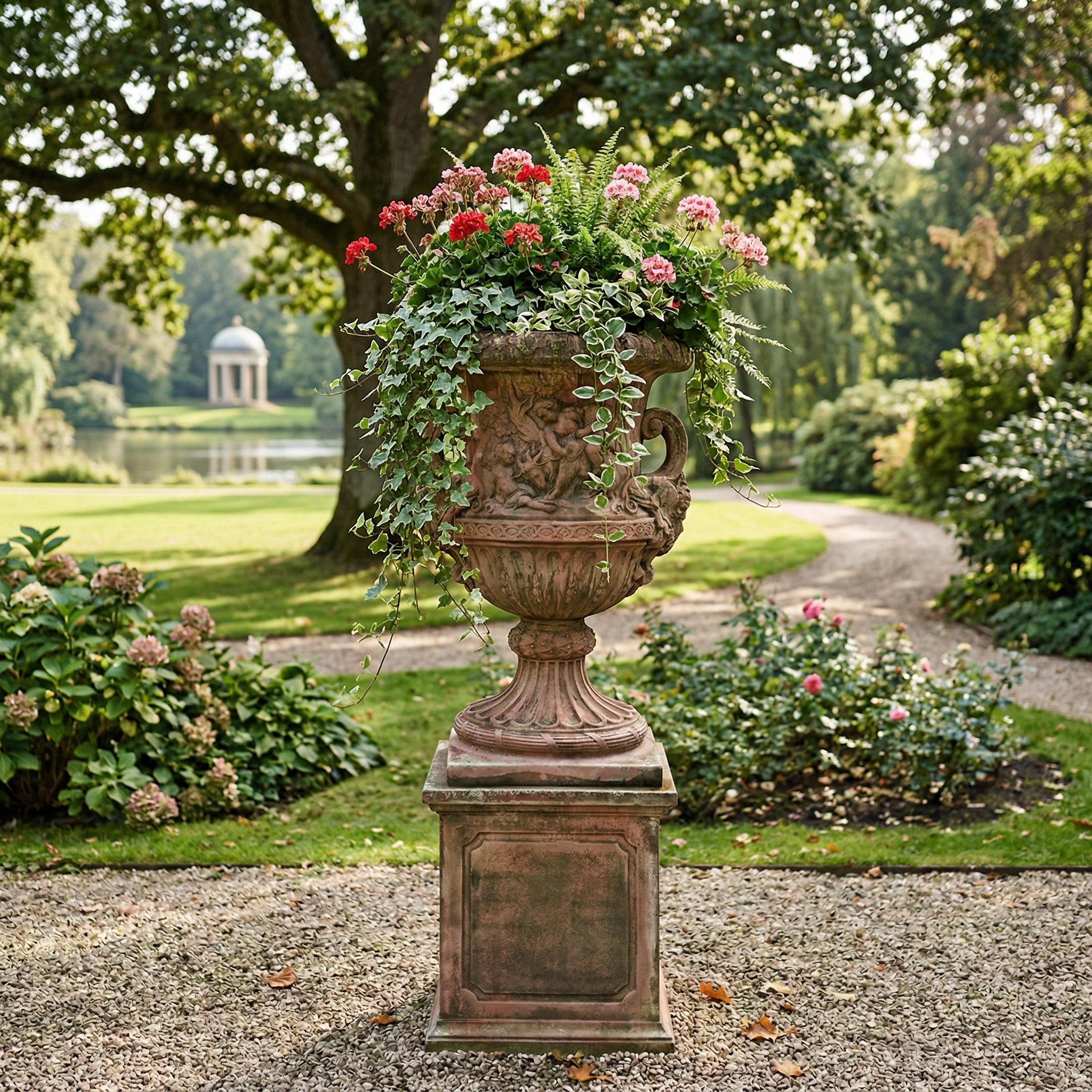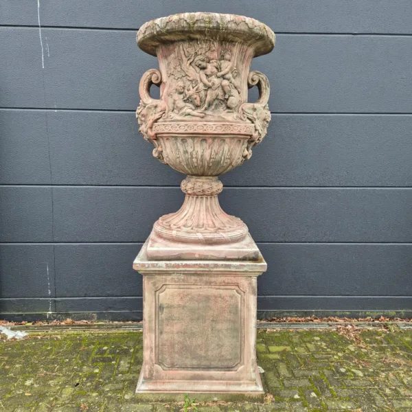 Aufwendig in nostalgischer Optik gestalteter Blumenkübel mit Sockel aus Steingut. Zerlegbar (2-teilig). Maße: Durchmesser 0,87 mHöhe 2,27 m