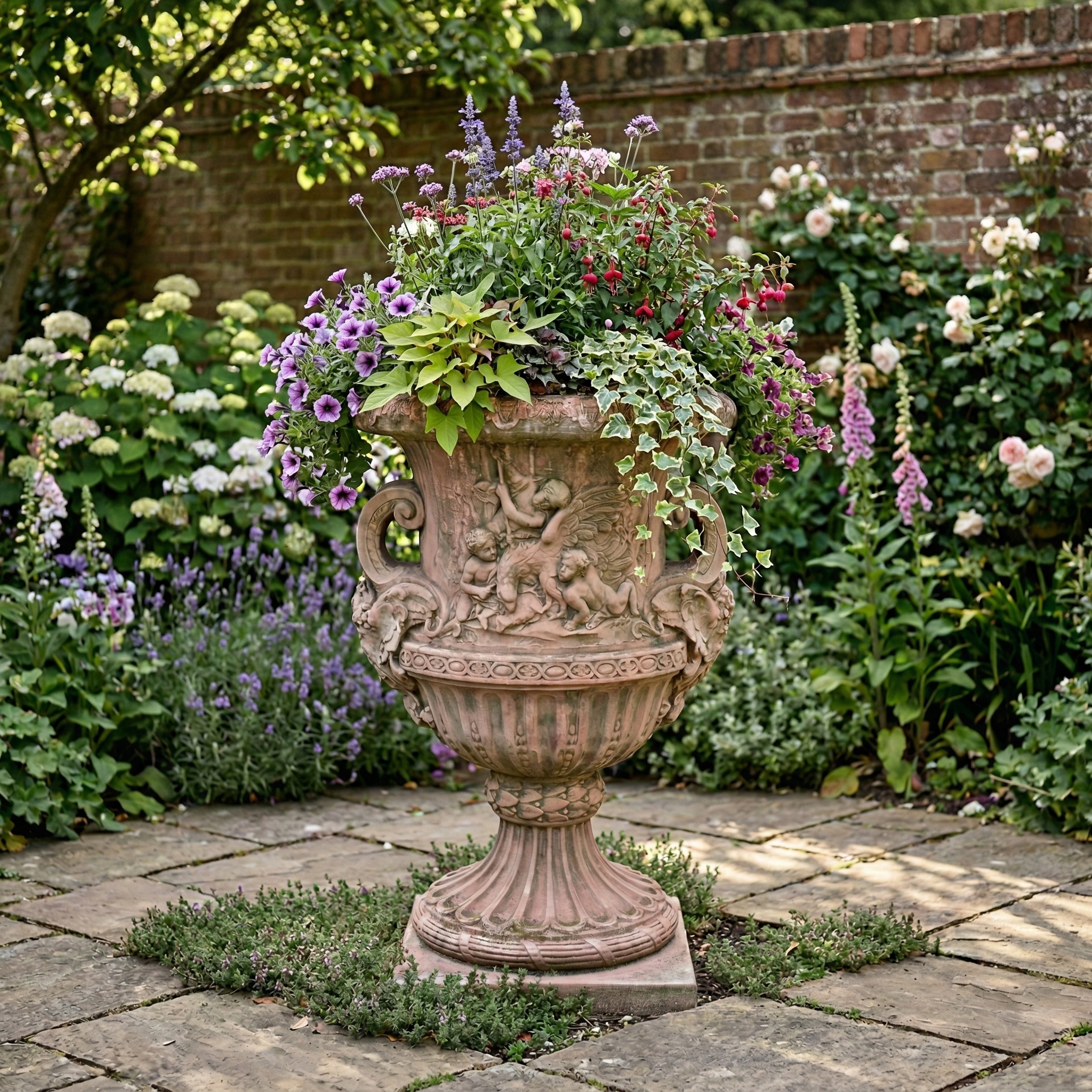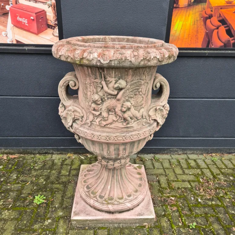 Aufwendig in nostalgischer Optik gestalteter Blumenkübel aus Steingut. Maße: Durchmesser 0,90 mHöhe 1,40 m