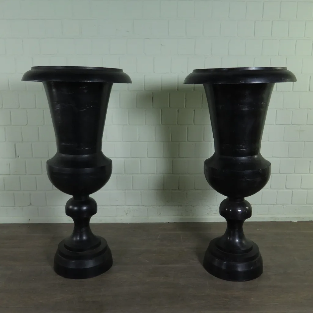 Durch die anmutige Form und dem schlanken Design wirkt diese XXL Vase fast schon wieder zierlich. Die Vase wurde im Aluminiumgussverfahren hergestellt und Schwarz lackiert. Mit oder ohne „Füllung“, diese Vase macht überall eine gute Figur! Stückpreis.   Maße:   Durchmesser 0,60 m Höhe 1,20 m