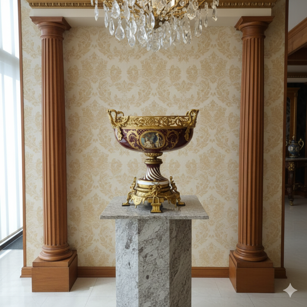 Elegante Vase/Schale aus Porzellan und Bronze  Diese prachtvolle Vase/Schale verbindet luxuriöses Design mit handwerklicher Perfektion. Das meisterhaft handbemalte Porzellan in Bordeauxrot mit goldenen Verzierungen wird von einer aufwendigen Bronzehalterung im Barockstil ergänzt. Die dekorativen Szenen und filigranen Details machen dieses Kunstwerk zu einem beeindruckenden Mittelpunkt für jedes Interieur. Ein exklusives Stück, das Eleganz und Kunstfertigkeit … Weiterlesen