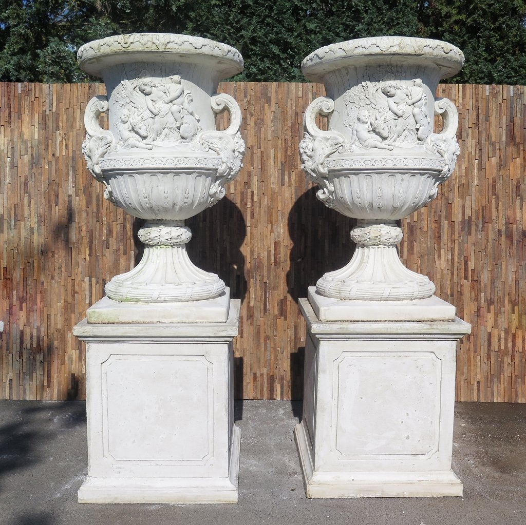 Aufwendig in nostalgischer Optik gestaltete Blumenkübel mit Sockel aus Steingut. Setpreis. Maße: Durchmesser 0,87 m Höhe 2,27 m