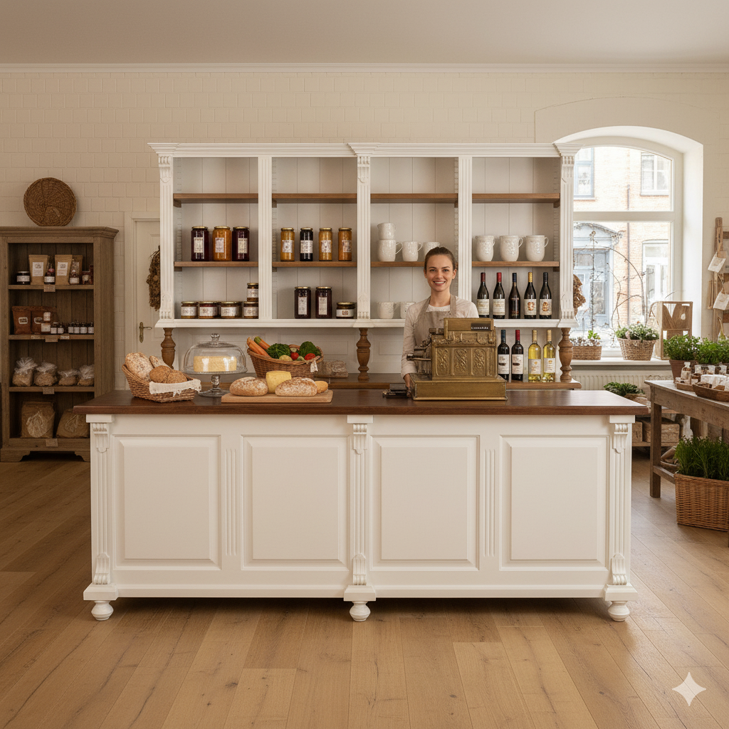 Der Tresen sowie der Verkaufsschrank Modell Mirjam aus massiv Weichholz besticht durch seine stilvolle Eleganz und der aufwendigen Verarbeitung. Die Kombination von nostalgischer Optik und moderner Funktionalität ist für alle Ladeneinrichtungen sowie vielen weiteren Einsatzgebieten geeignet. Die Möbel werden komplett fertig montiert geliefert und sind somit sofort einsatzbereit. • Massivholz • Farbton: Arbeitsplatte, Regalböden und … Weiterlesen