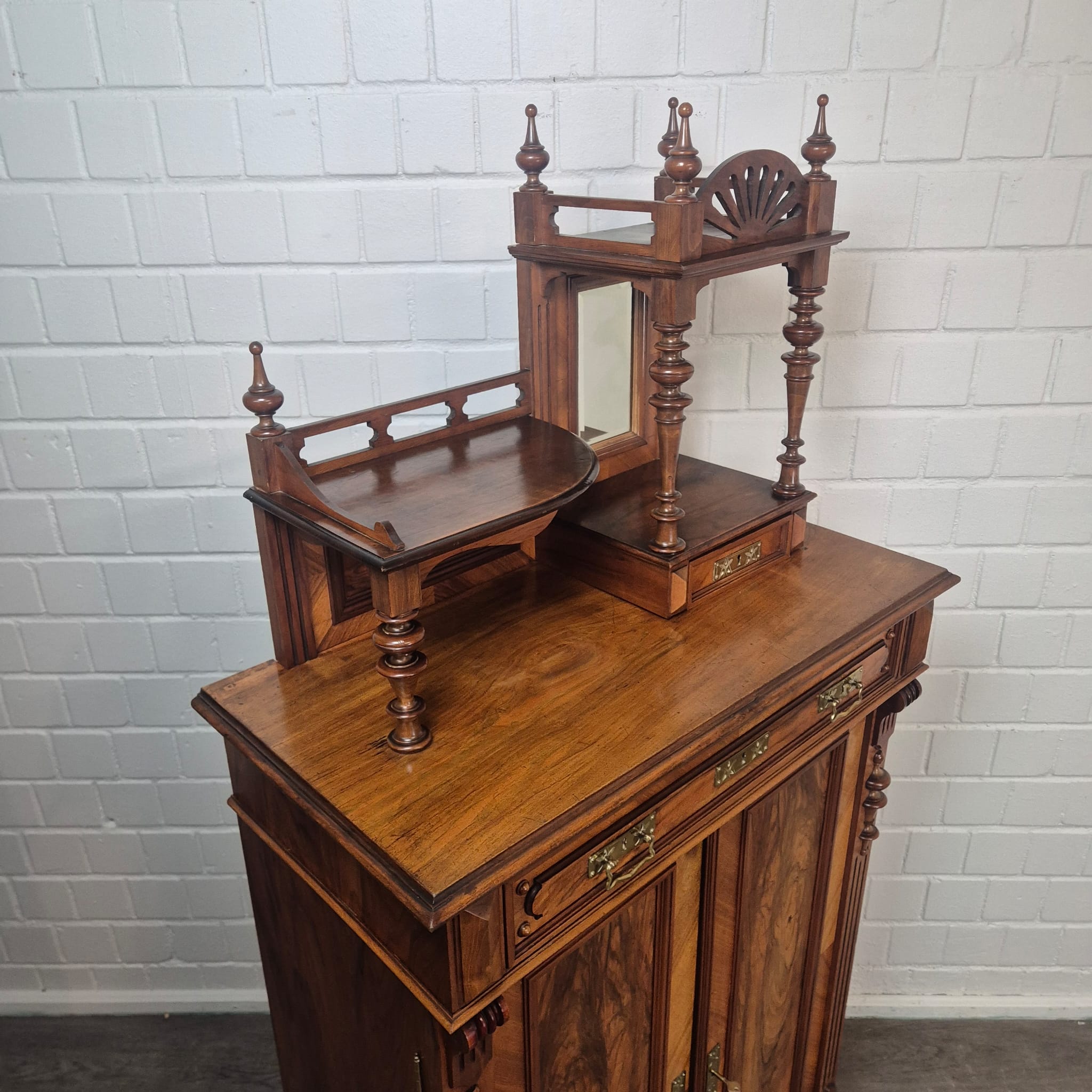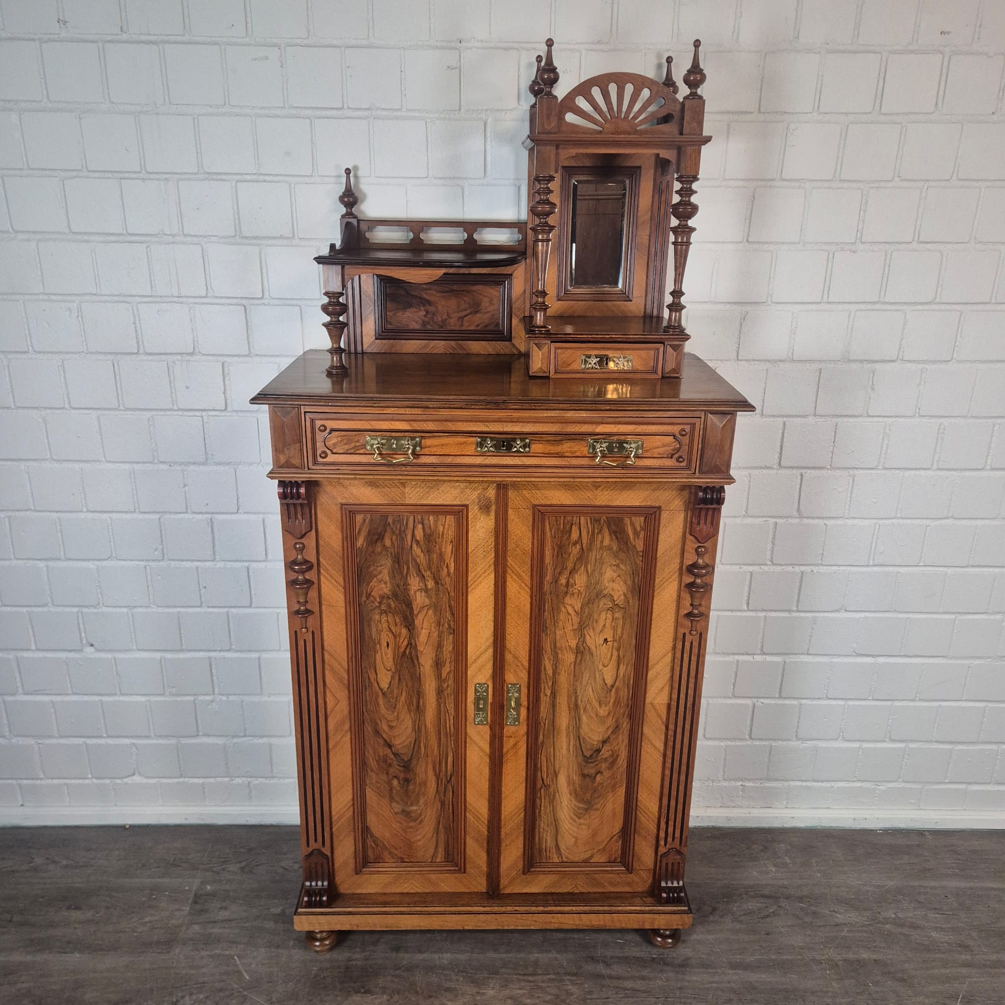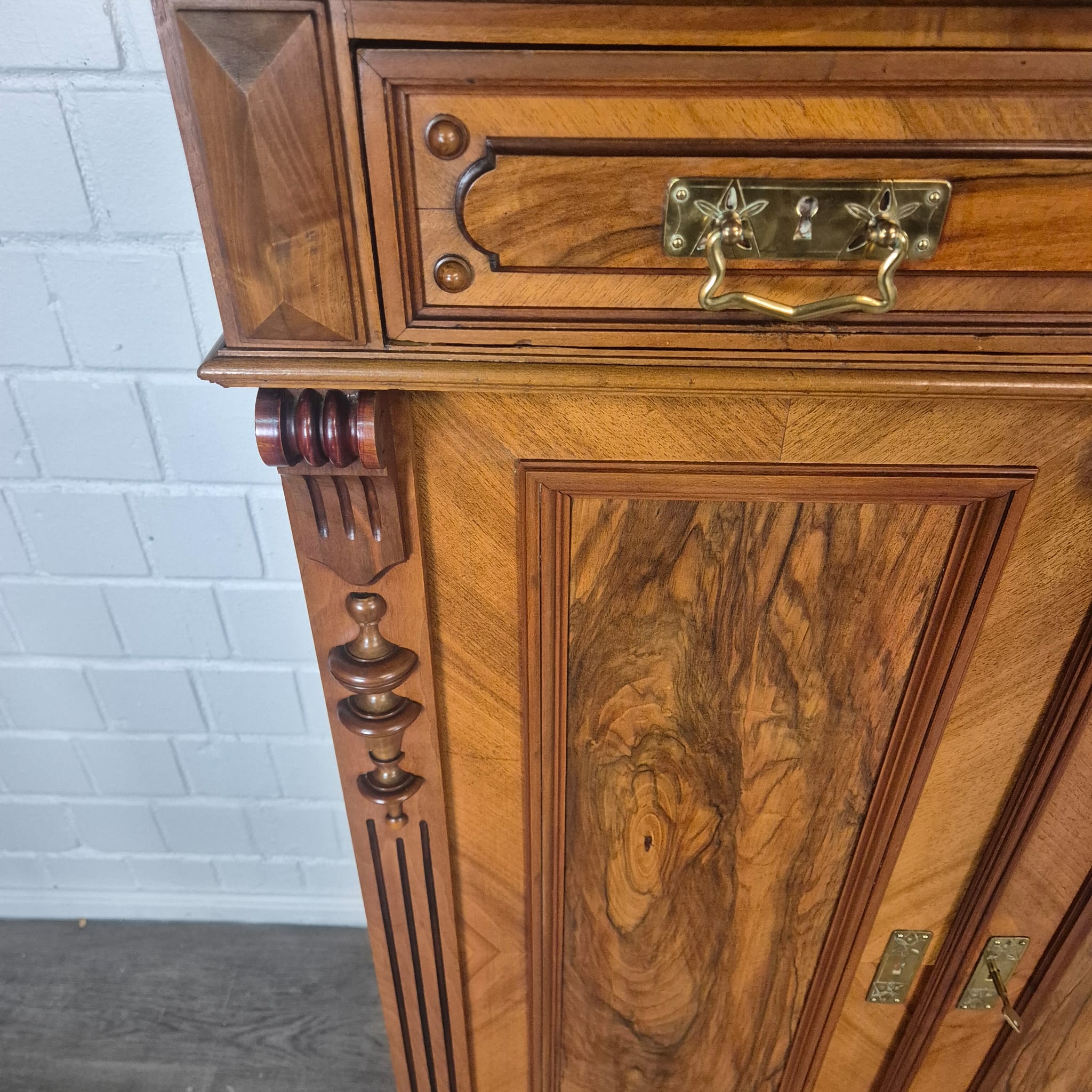 Mobile Vertiko con alzatina in stile Art Nouveau restaurato, impiallacciato in noce e laccato, risalente al 1900 circa. Il mobile è in ottime condizioni e presenta solo minimi segni di usura. Smontabile (2 pezzi).