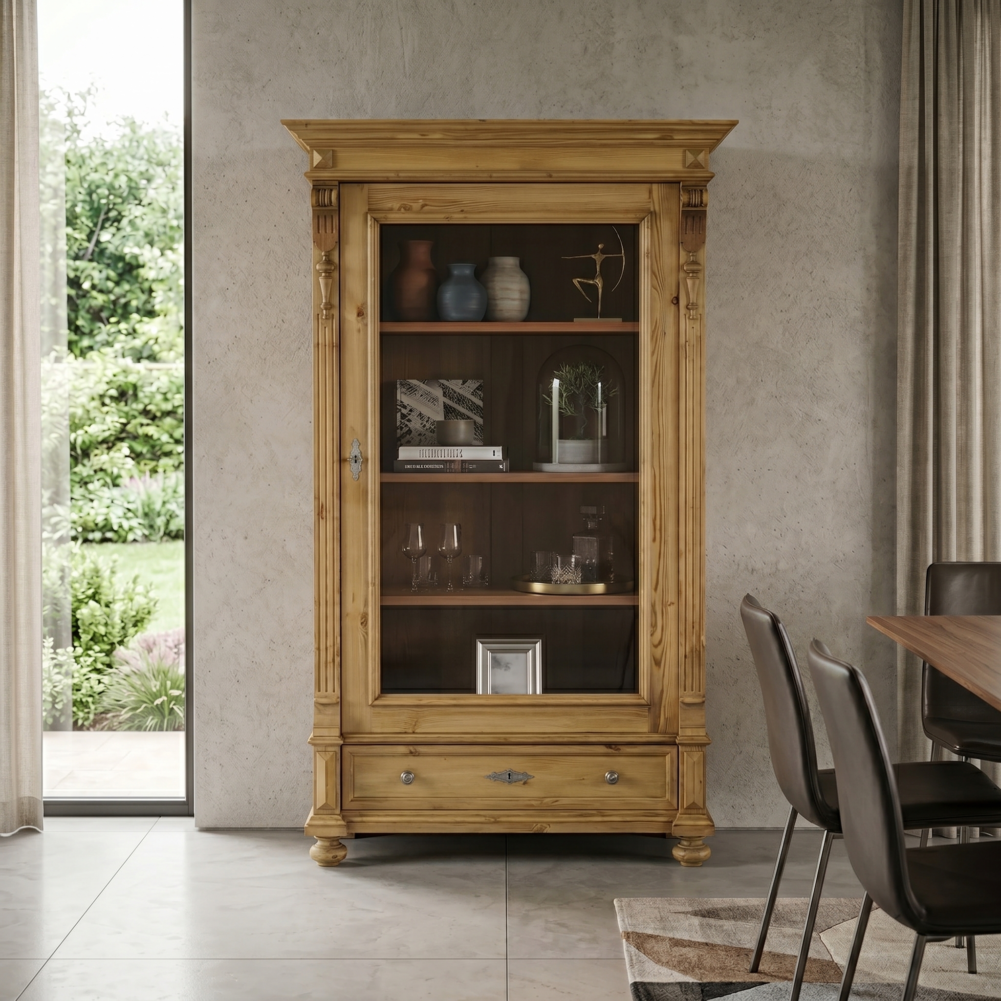 Restaurierte Gründerzeit Vitrine aus massiv Kiefer (gewachst) von ca. 1880. Der Schrank befindet sich in einem sehr guten Zustand und weist nur minimale Gebrauchsspuren auf.  3 Regalboden 1 Schublade Massivholz Gründerzeit ca. 1880 Maße: Breite 1,02 m Höhe 1,70 m Tiefe 0,52 m