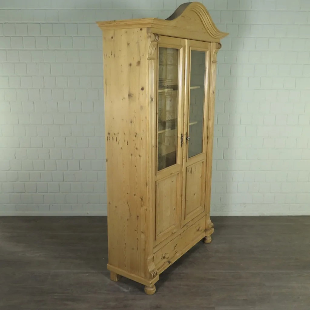 Restaurierte Vitrine hergestellt aus massiv Kiefer (gewachst) im Gründerzeitstil. Der Schrank befindet sich in einem guten Zustand und weist nur leichte Gebrauchsspuren auf.    4 Regalboden 1 Schublade Massivholz Gründerzeitstil   Maße:   Breite 1,17 m Höhe 2,10 m Tiefe 0,37 m – 0,46 m