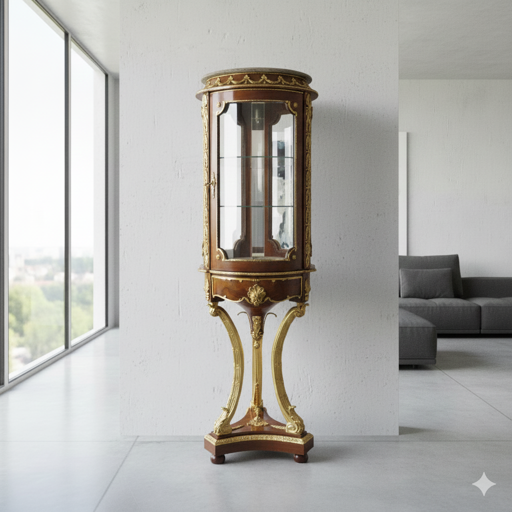 2.100,00€ Preis ohne SteuerStilvolle mit 2 Glasböden, goldenen Beschlägen und Marmorplatte ausgestattete Vitrine im Barockstil. Die in Nussbaum furnierte Vitrine wurde mit gebogenen Glas versehen. • 2 Regalboden aus Glas • goldfarbige Beschläge • Nussbaum Furnier • Marmorplatte Maße: Durchmesser 0,55 m Höhe 1,47 m