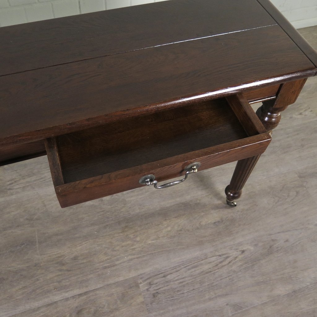 In englischer Optik gestalteter Wandtisch auf Rollen hergestellt aus massiv Eiche.   • 2 Schubladen• massiv Eiche• 4 Rollen Maße: Breite 1,50 mHöhe 0,79 mTiefe 0,37 m