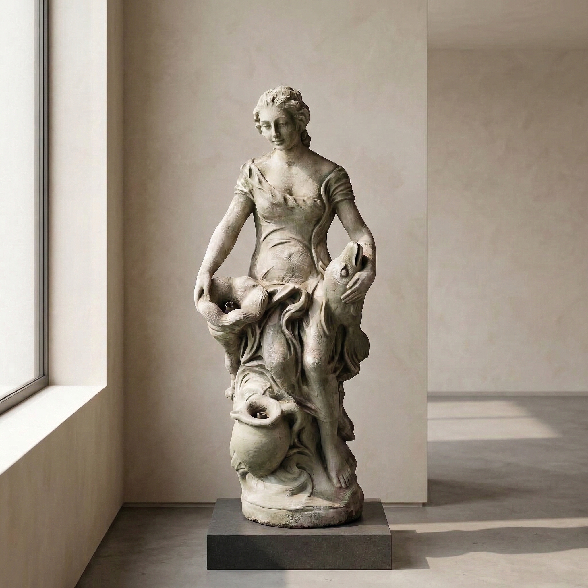 In nostalgischer Optik gestalteter Wasserspeier mit der Darstellung einer Frau mit Fisch und Krügen. Maße: Breite 0,40 m Höhe 1,00 m Tiefe 0,26 m