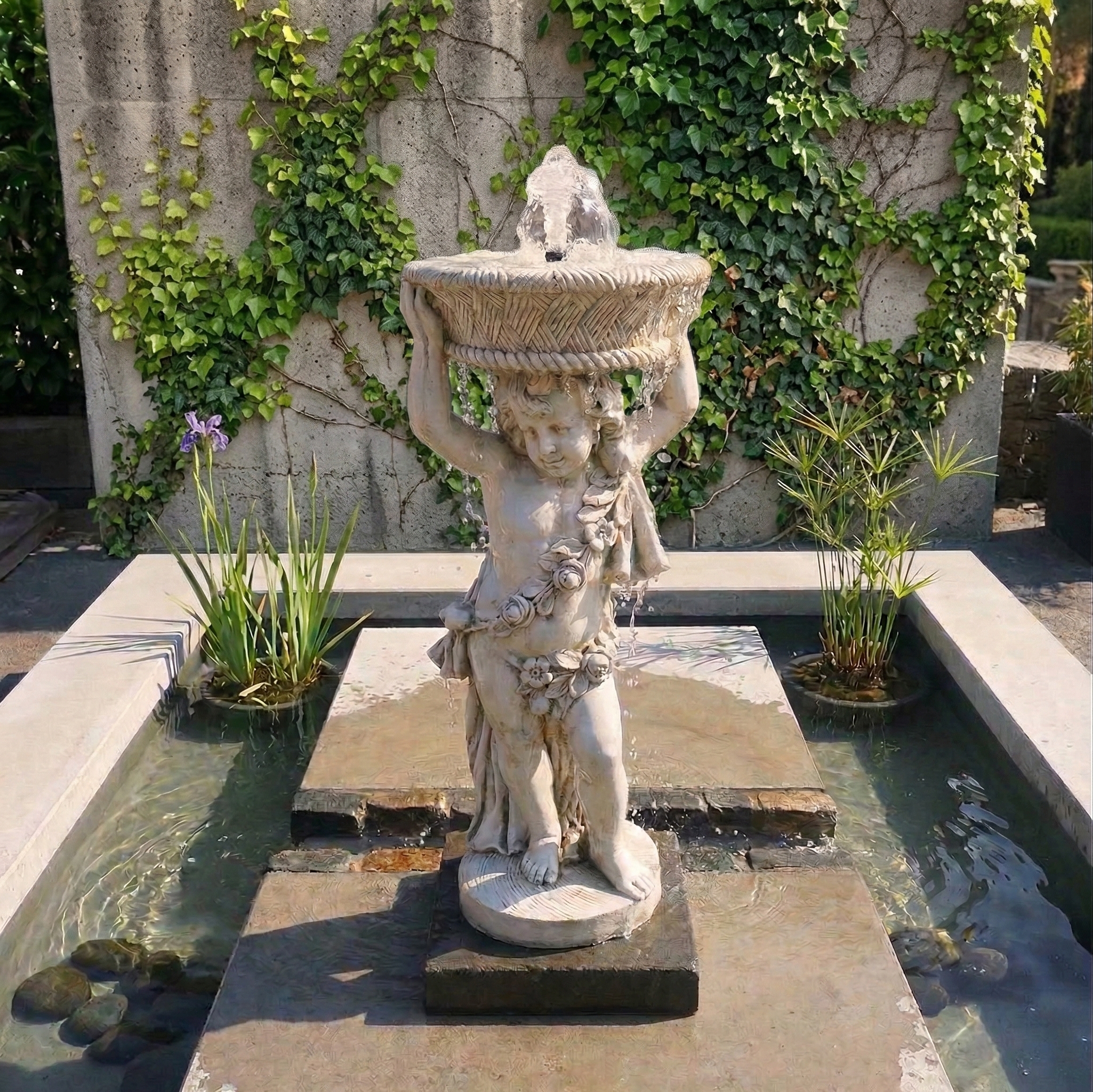 In nostalgischer Optik gestalteter Wasserspeier mit der Darstellung eines Jungen mit Schale. Maße: Durchmesser 0,42 m Höhe 1,00 m