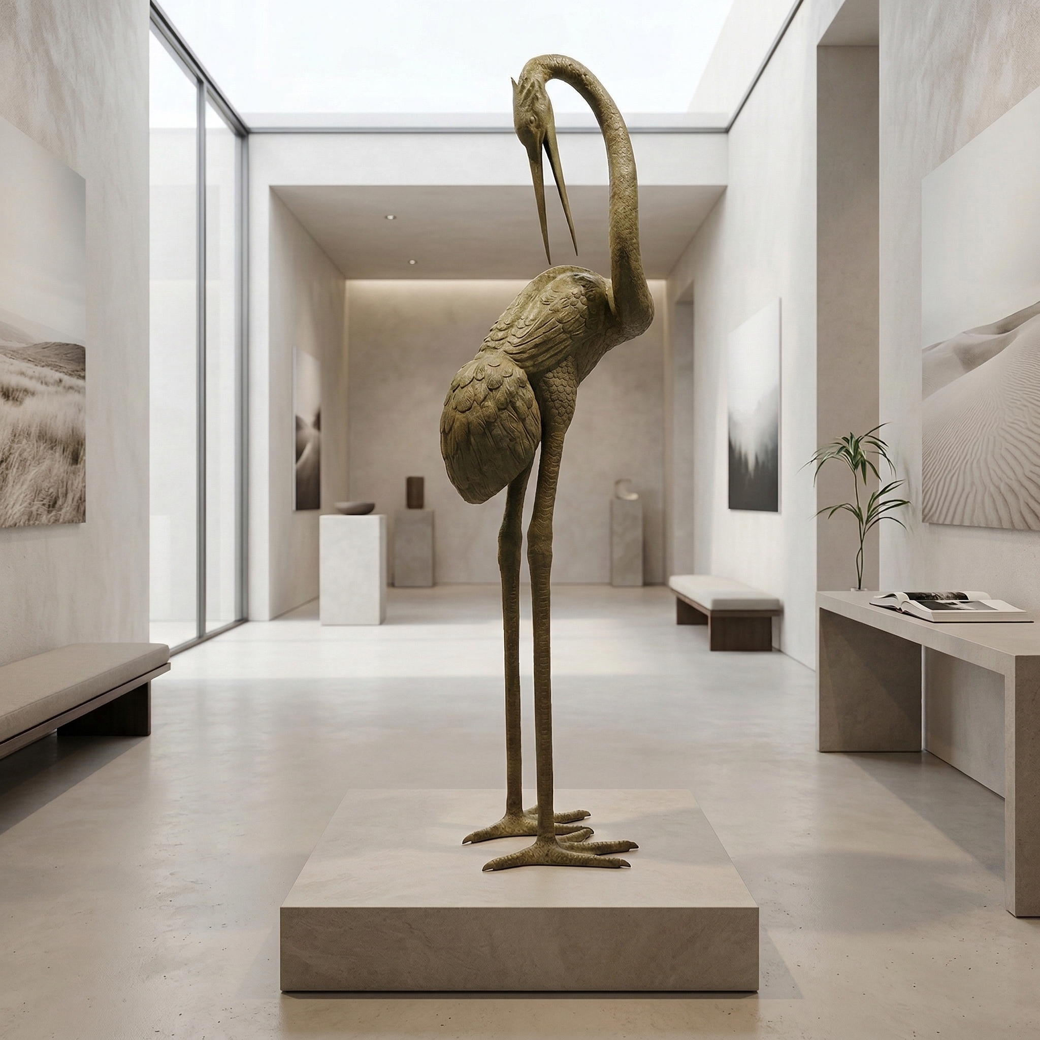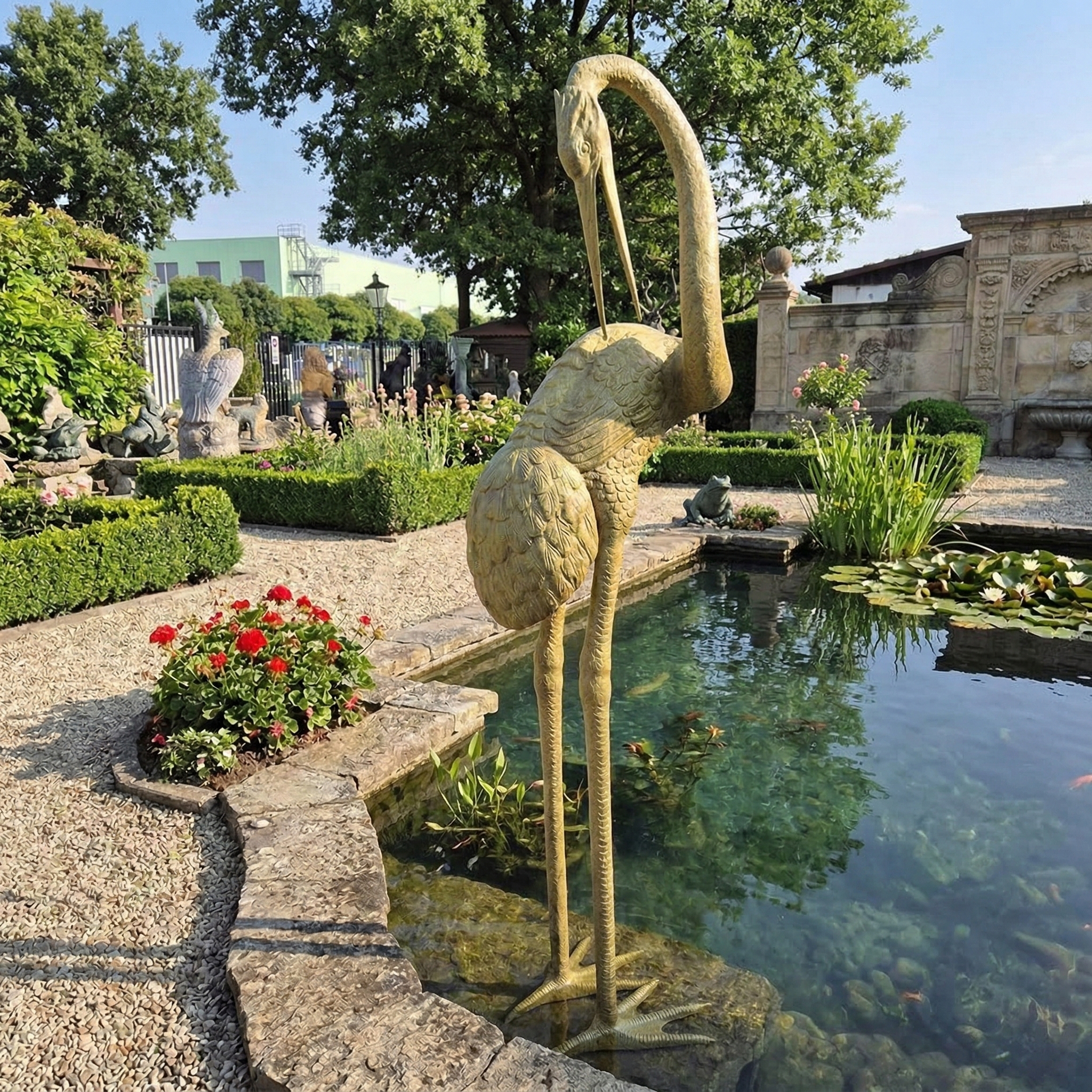 Detailgetreue und formschöne Darstellung eines Kranichs. Als Wasserspeier oder Skulptur nutzbar. Bei Nutzung als Wasserspeier sprudelt das Wasser aus dem Schnabel des Kranichs. Maße: Breite 0,54 mHöhe 2,30 mTiefe 0,70 m