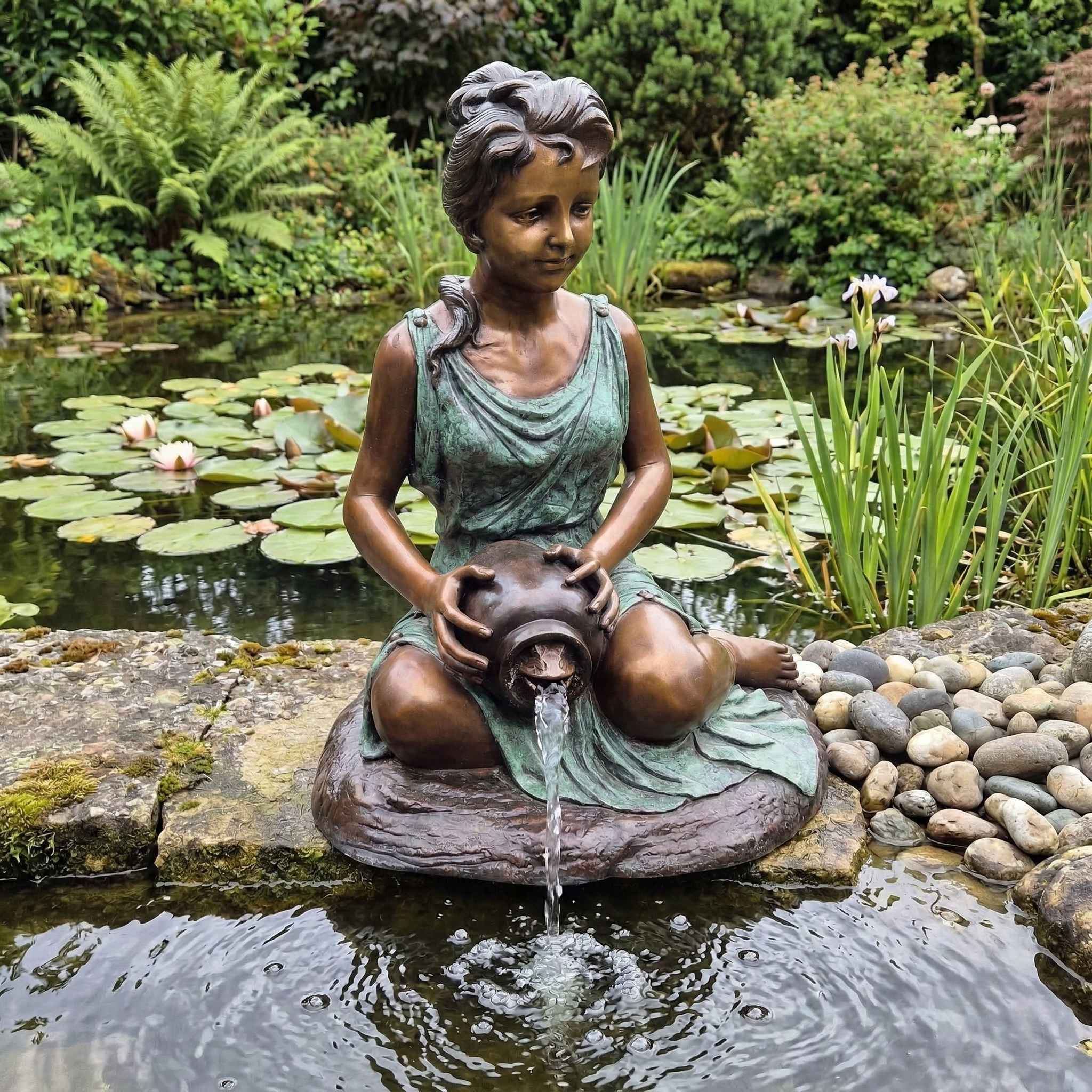 Bronze Wasserspeier „Mädchen mit Krug“ Dieser wunderschöne Wasserspeier aus hochwertiger Bronze zeigt ein detailreich gearbeitetes, kniendes Mädchen mit einem kunstvoll gestalteten Krug. Die Skulptur besticht durch ihre kunstvolle Patina, die dem Gewand eine lebendige, grüne Färbung verleiht, während das Gesicht und die Arme in warmem Bronzeton glänzen. Die Figur eignet sich ideal als dekoratives Wasserspiel … Weiterlesen